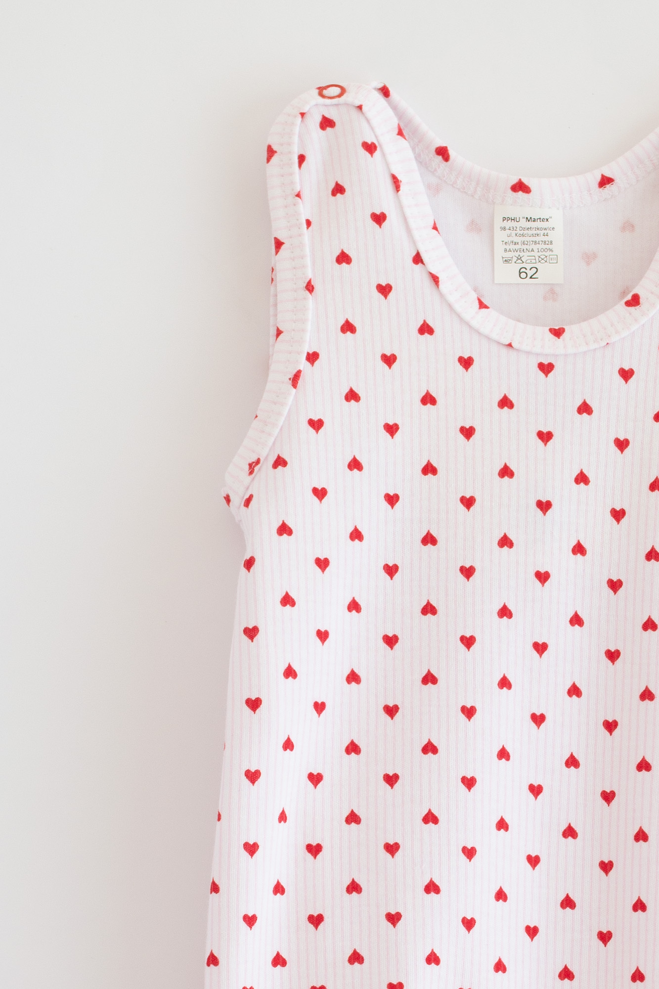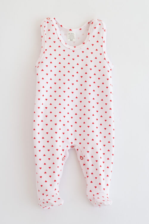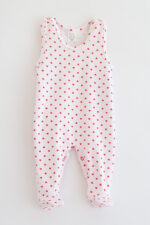 Kojenecké dupačky pro kojence s potiskem červených srdíček. Vyrobené ze 100 % bavlny, zajišťují prodyšnost pokožky a volnost pohybu.