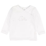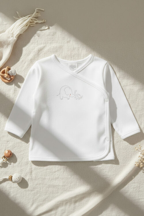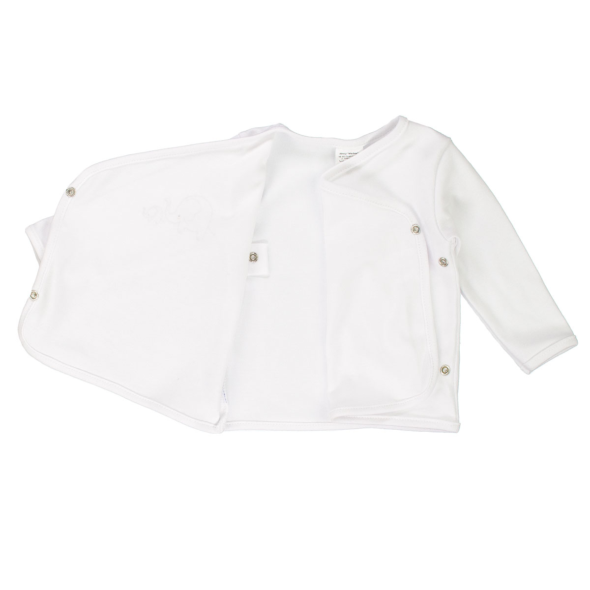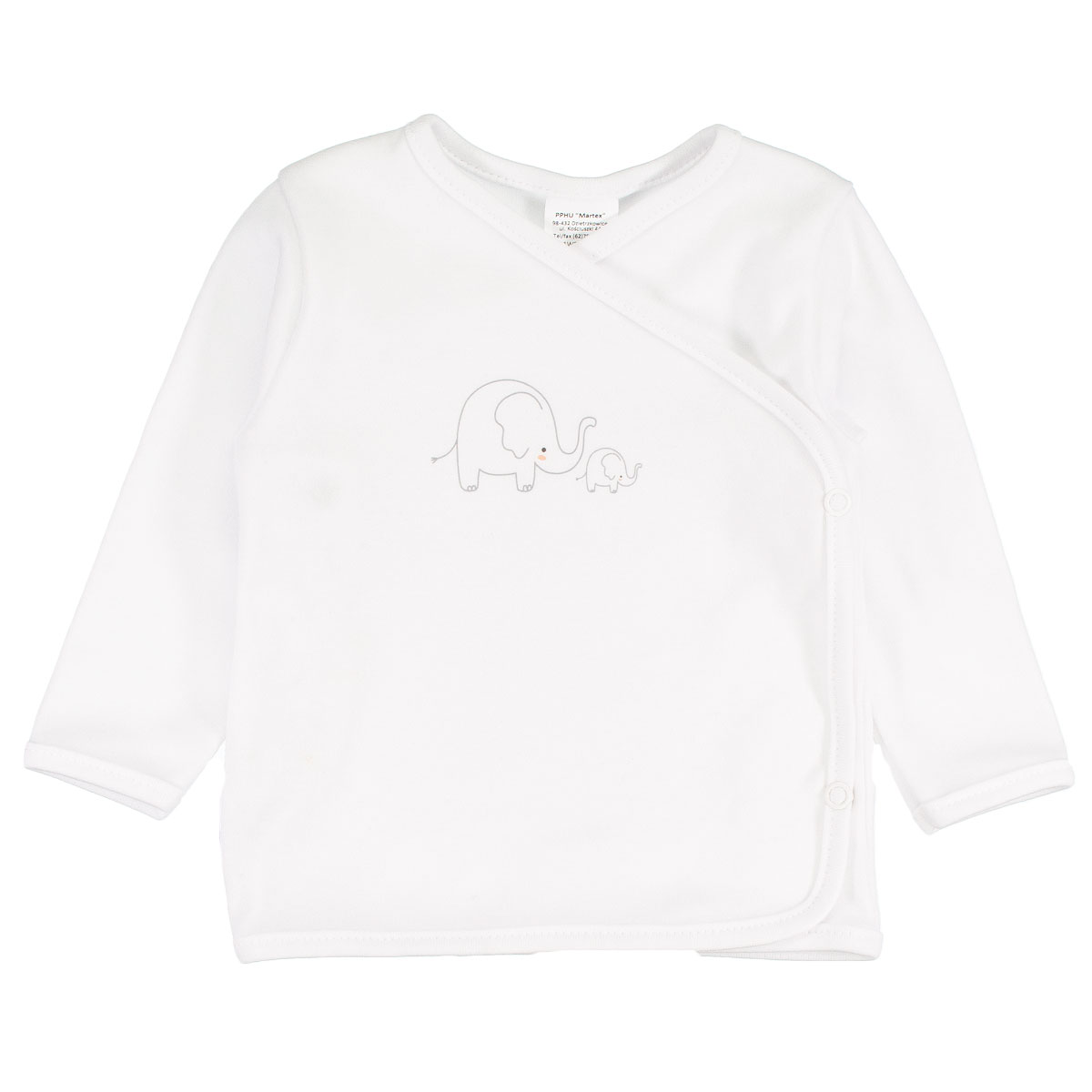 Obálková košile se zapínáním na patentky, zdobená obrázkem. Vyrobeno ze 100% bavlny. Velmi vhodné pro oblékání novorozence.