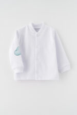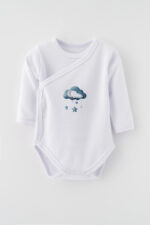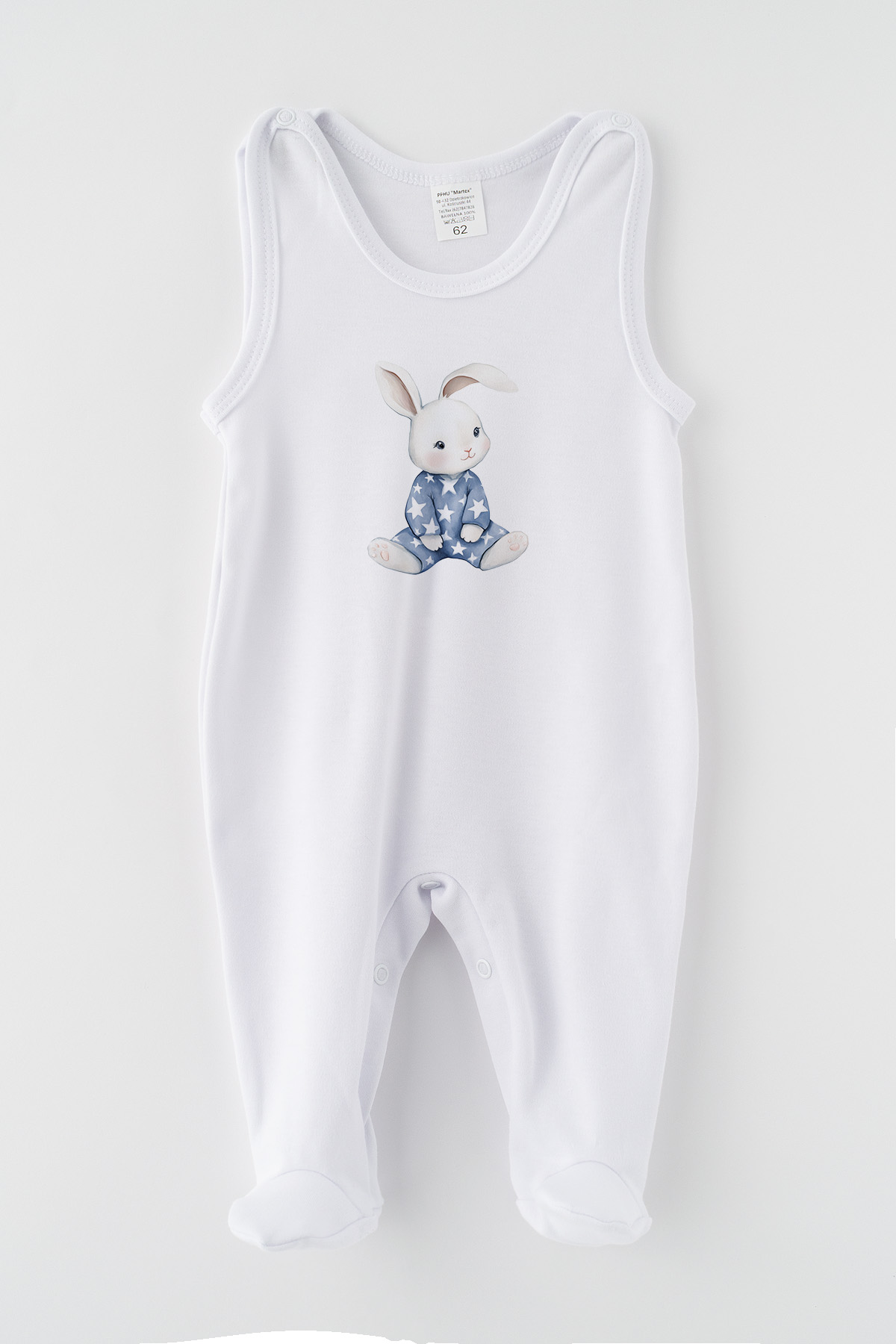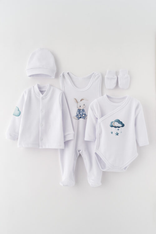 Kojenecká sada s roztomilým potiskem králíčka v pyžamu spojuje funkčnost a pohádkový design. Jemná tkanina šetrná k dětské pokožce a pečlivé zpracování zaručují, že každý prvek je nejen krásný, ale i praktický. Materiál: 100% bavlna. Pletenina s certifikátem Oeko-Tex.