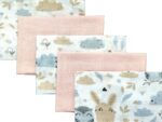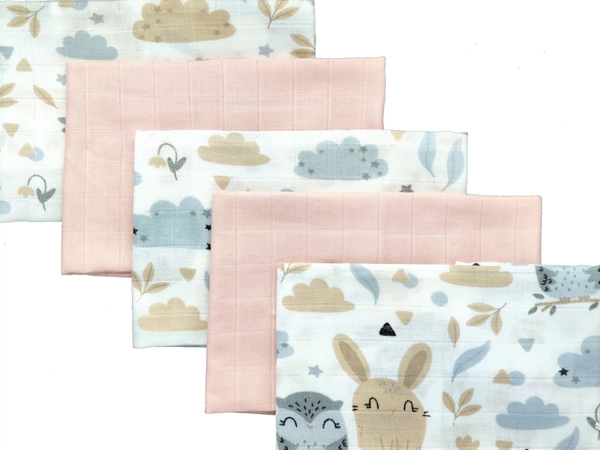Muślin to dwuwarstwowa tetra z 100% bawełny, cechująca się niezwykłą lekkością i przewiewnością. Pieluszki z tego materiału mogą być wykorzystywane już od pierwszych dni życia . Rozmiar pieluszek 38/38cm. W paczce jest 5 pieluszek 3 drukowane 2 gładkie