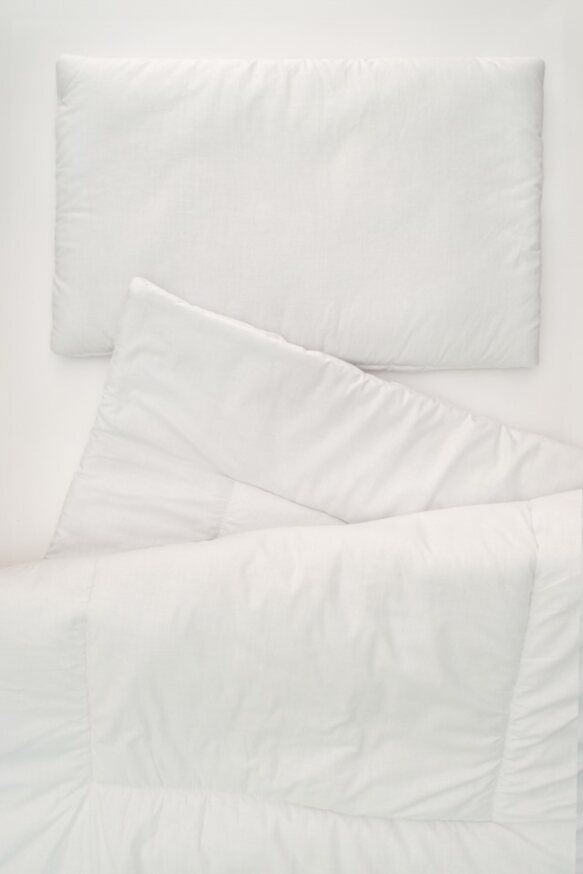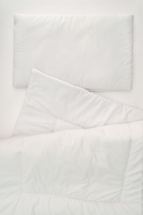 Kompletní sada ložního prádla – měkký polštář a nadýchaná přikrývka pro klidný a zdravý spánek vašeho dítěte. Vyrobeno z prodyšné tkaniny příjemné na dotek, s antialergickým výplněm, který zajišťuje optimální cirkulaci vzduchu. Klasická bílá barva se hodí do každého dětského pokoje. Snadná údržba – možnost praní v pračce a rychlé schnutí. Ideální pro celoroční použití – v létě vzdušná, v zimě příjemně hřejivá. Sada obsahuje přikrývku (90×120 cm) a polštář (40×60 cm).