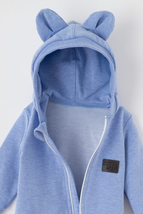 Mėlynas kūdikių kombinezonas su gobtuvu, ausytėmis ir meškučio aplikacija