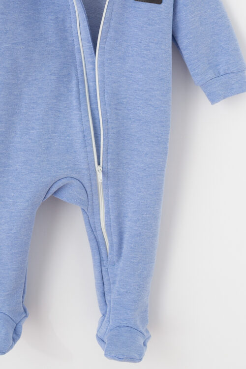 Švelnus ir jaukus mėlynos spalvos kombinezonas kūdikiams – puikus pasirinkimas tiek kasdienai, tiek ramiam miegui. Pagamintas iš minkštos ir tamprios trikotažinės medvilnės, švelnios kūdikio odai. Gobtuvas su mielomis ausytėmis suteikia žaismingumo, o įstrižas užtrauktukas leidžia lengvai aprengti mažylį ir pakeisti sauskelnes. Ant krūtinės – kontrastinga meškučio aplikacija. Uždari pėdučiai saugo nuo šalčio, todėl šis kombinezonas puikiai tinka vėsesnėms dienoms ir vakarams. Sudėtis – 100% medvilnė.