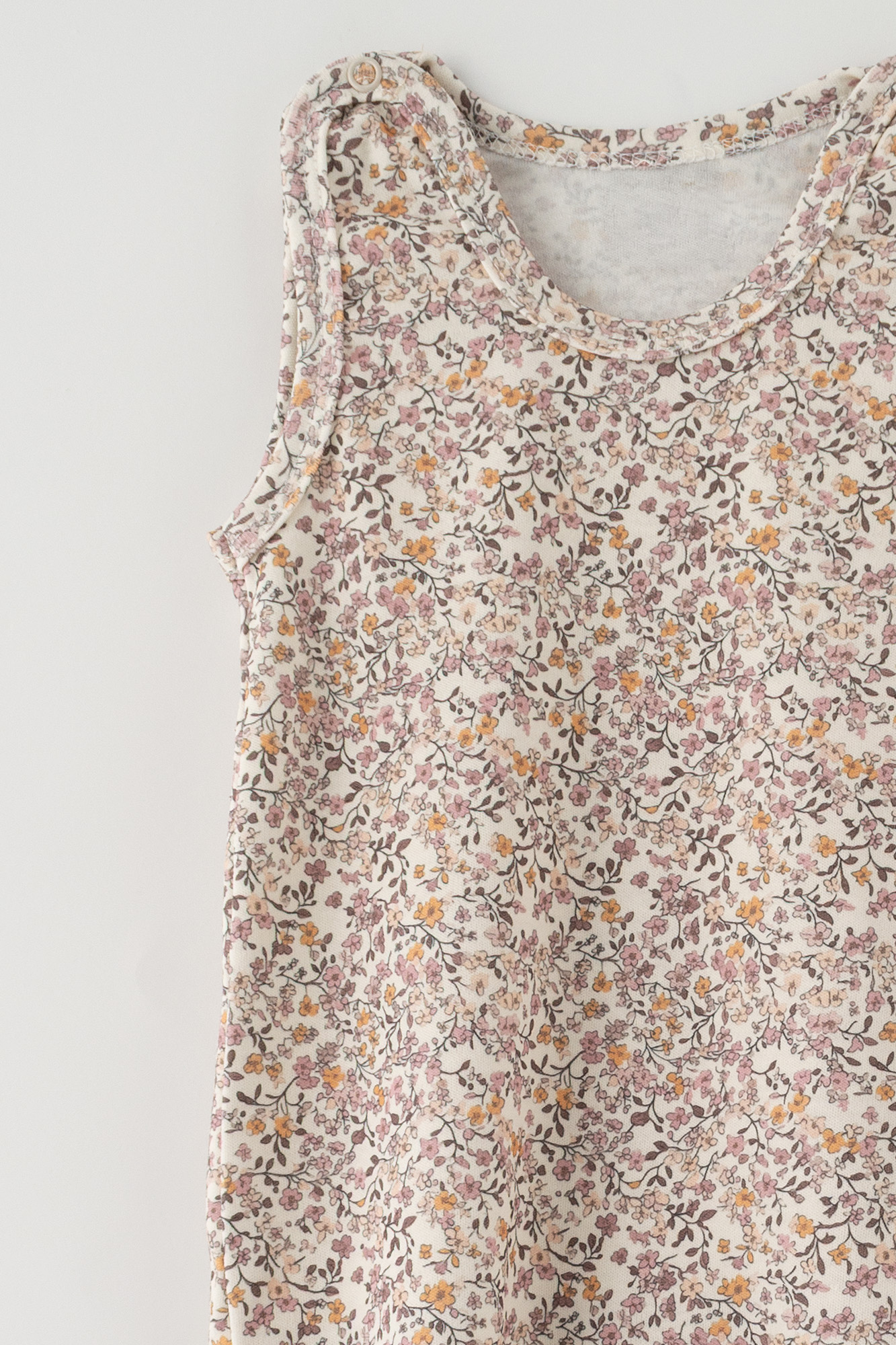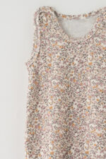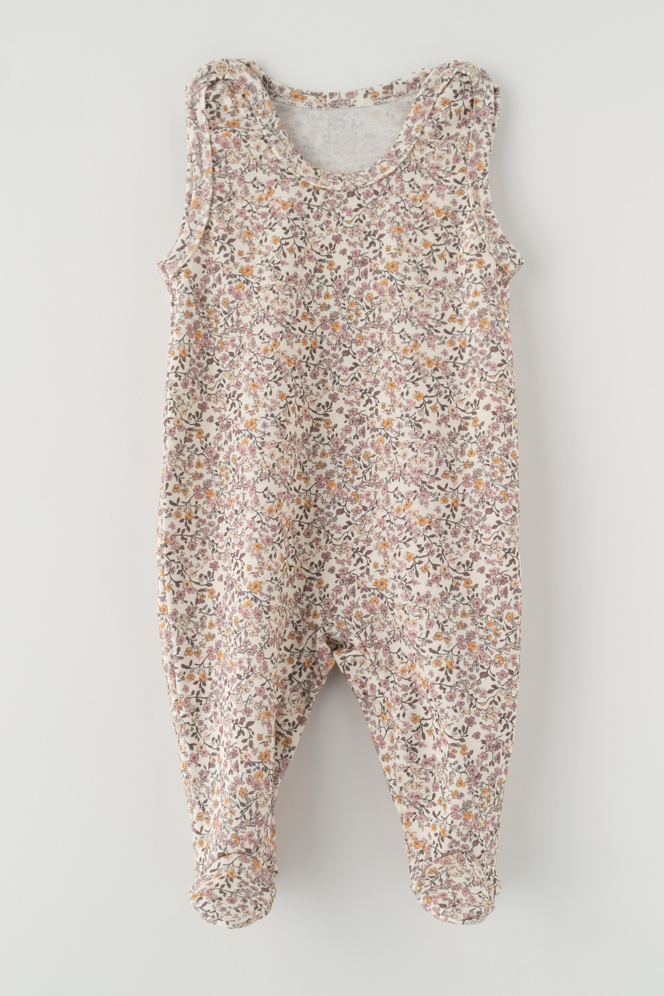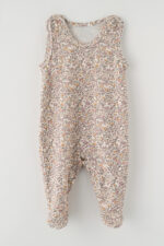 Žavingas kūdikio miegojimo kombinezonas pagamintas iš švelnios, odai malonios medžiagos, kuri užtikrina komfortą visą dieną. Modelis yra subtilių atspalvių – šviesiame, kreminiame fone puošiasi lengvas, smulkus gėlių raštas rožinės, geltonos ir rudos spalvos atspalviais. Kombinezonas turi patogius užsegimus ant pečių ir spaudes tarpkojų srityje, kurie palengvina aprengimą ir sauskelnių keitimą. Uždaros kojinės padeda išlaikyti šilumą ir daro aprangą idealiai tinkančią tiek kasdienai, tiek miegui. Subtilus, natūralus raštas ir praktiškas kirpimas daro šį kombinezoną puikiu pasirinkimu kūdikiams, derinant funkcionalumą ir žavingą išvaizdą.