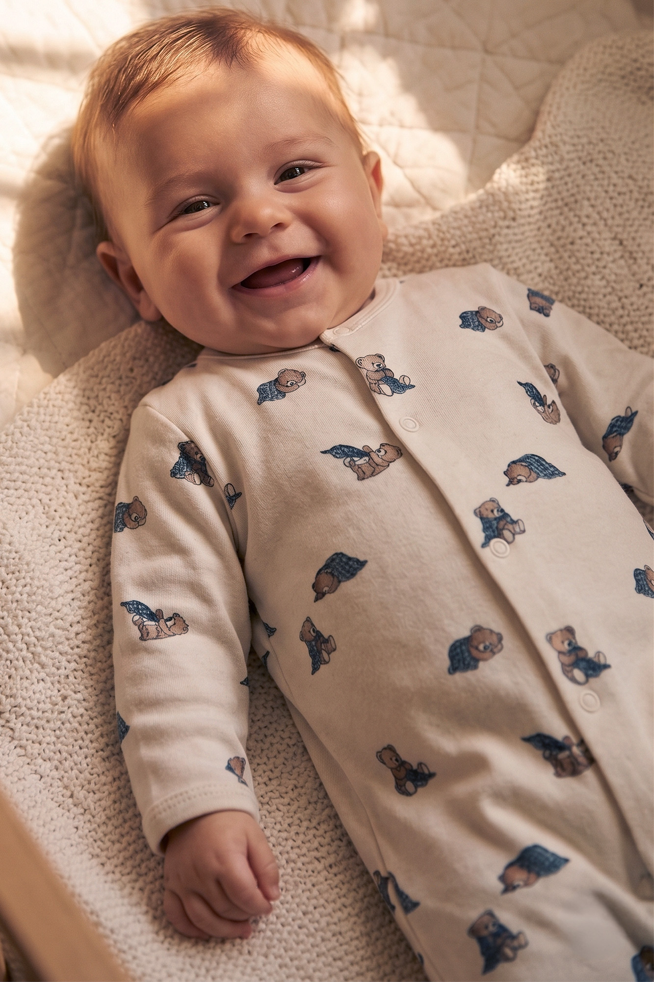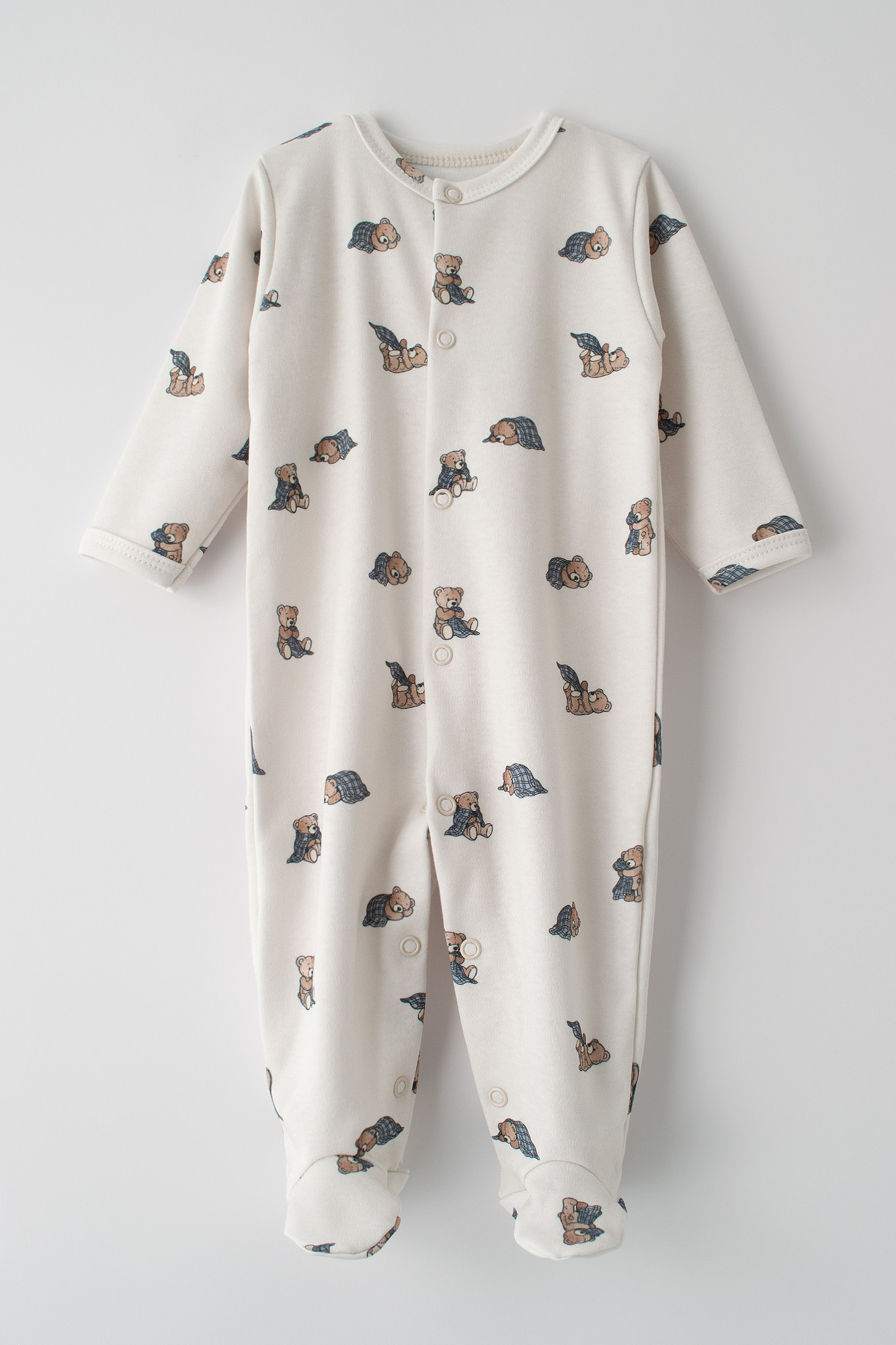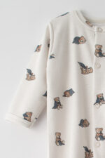 Žavingas kūdikių romperis subtilios kreminės spalvos su meškiukų raštais. Pagamintas iš švelnios ir odai draugiškos medžiagos, užtikrina komfortą ir judėjimo laisvę visą dieną ir naktį. Praktinis užsegimas spaudėmis leidžia greitai persiauti, o įmontuotos kojytės papildomai apsaugo nuo vėsos. Idealus pasirinkimas kūdikiui bet kuriuo metų laiku.