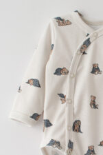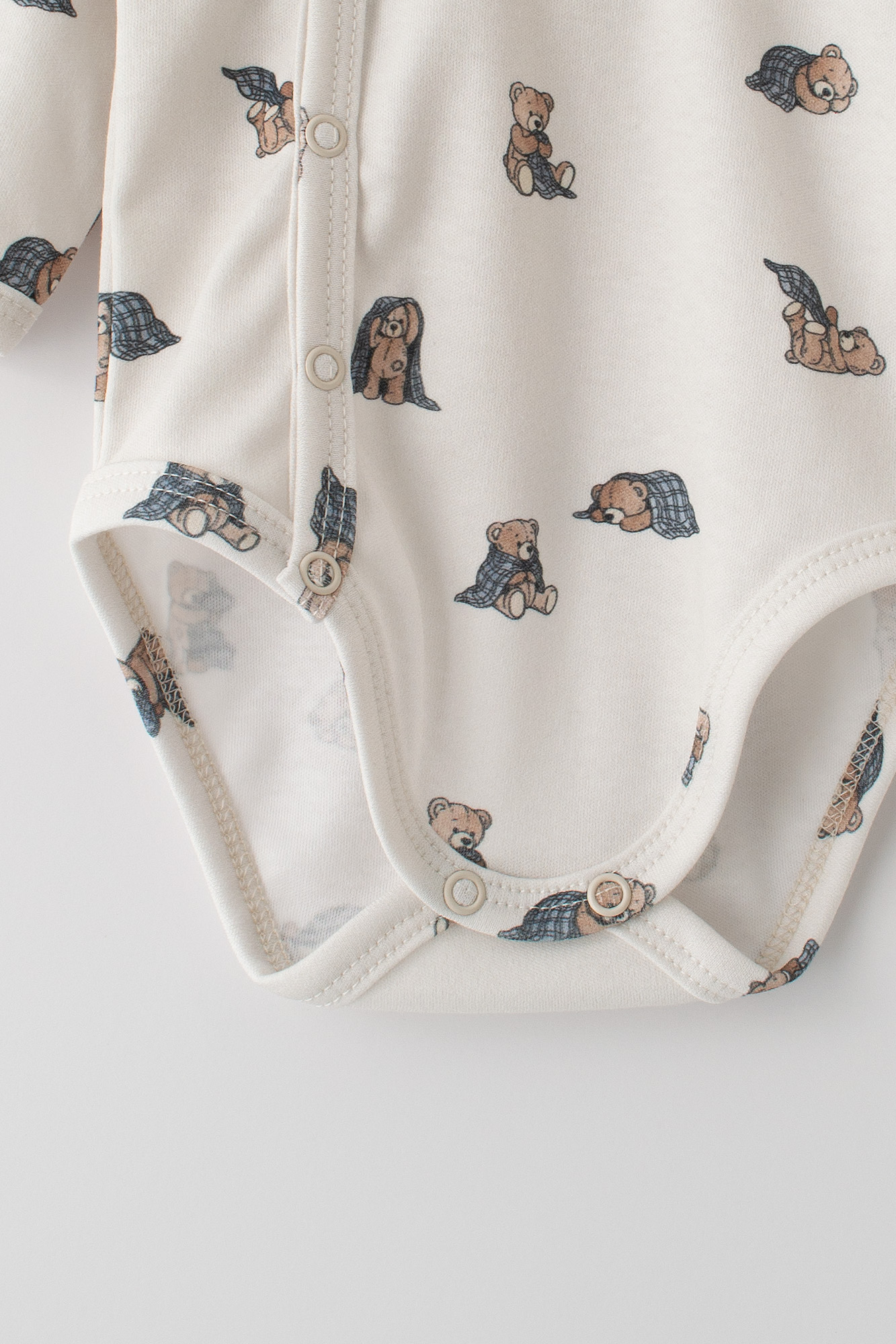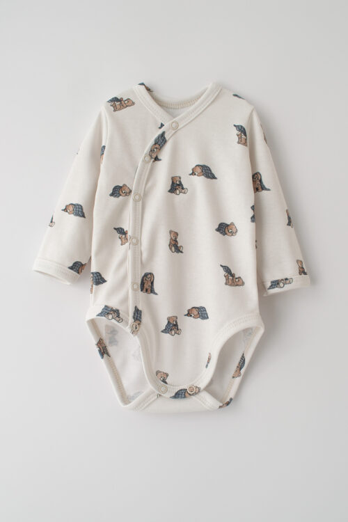 Vokelių kūdikių bodis su ilgomis rankovėmis ir meškučiais. Praktinis vokelio dizainas: visiškai susagstomas spaudėmis, kad būtų lengva aprengti ir pakeisti vystyklus. Aukšta medžiagos kokybė: pagamintas iš minkštos, kvėpuojančios ir švelnios medvilnės, saugios jautriai kūdikio odai. Žavus dizainas: neutralus ecru atspalvis su mažais, rudais meškučiais. Naudojimas: puikus kasdienės aprangos elementas arba pirmasis sluoksnis vėsesnėmis dienomis. Tinka tiek berniukams, tiek mergaitėms.