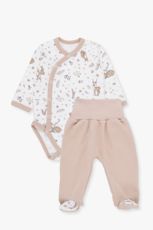 Minkštas ir patogus kūdikių komplektas, pagamintas iš 100% natūralios medvilnės. Rinkinį sudaro visiškai atsegamas smėlinukas – itin patogus pirmiesiems kūdikio mėnesiams, bei pusiau kombinezonas su minkšta juosmens juostele, lengvam aprengimui. Dekoruotas mielais elniukų ir gamtos motyvais. Iš šios kolekcijos taip pat rasite kombinezoną, komplektą su šliaužtinukais, marškinėliais ir kepuryte.