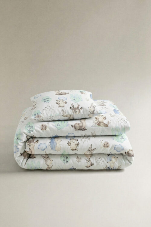 Žavinga vaikiška patalynė su mielais miško gyvūnėliais baltame fone – elniukais, laputėmis ir ežiukais tarp lapijos ir krūmelių. Komplektą sudaro antklodė (80×100 cm) ir pagalvė (40×60 cm) su antialerginiu užpildu. Patalynės audinys pagamintas iš 100 % medvilnės, o užpildas – iš švelnios antialerginės vatos. Puikus pasirinkimas mažiesiems gamtos mylėtojams.