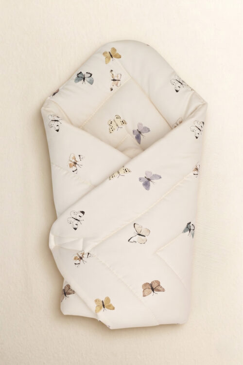 Išskirtinis kūdikio vokelis sujungia funkcionalumą ir subtilią estetiką. Sukurtas naujagimiams, užtikrina šilumą, patogumą ir saugumo jausmą nuo pirmųjų gyvenimo dienų. Švelnus drugelių raštas kartu su šviesiu, kreminiu audiniu suteikia visumai lengvumo ir elegancijos.