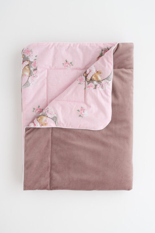 Švelnus, dvipusis pledas – tobulas pasirinkimas jūsų mažyliui. Viena pusė pagaminta iš malonaus liesti audinio pudros rožinės spalvos su mielais meškučių ir gėlių piešinėliais, kita – iš tekstūrinio veliūro švelniai rusvos rožinės atspalvio. Pledas lengvas, šiltas ir kvėpuojantis – puikiai tinka tiek į lovelę, tiek pasivaikščiojimams vežimėlyje.