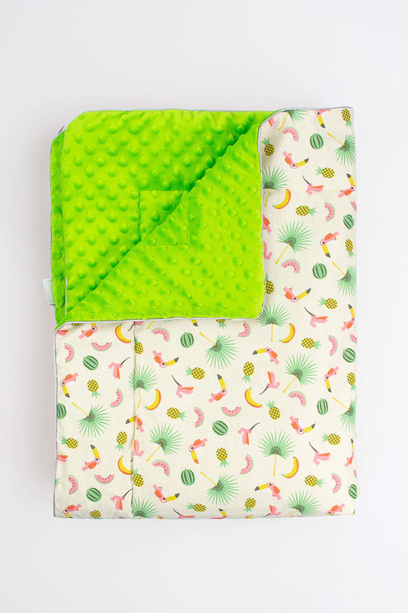Kolorowy ocieplany kocyk z minky połączony z kolorową 100% bawełną.Wypełniony jest antyalergiczną włókniną. Wykończony w koło wypustką.Kocyk ma wymiary 75/100. Gramatura minky to 350g. Kocyk może być wykorzystany jako kołderka do łóżeczka.Prać można w 30 st. nie wolno suszyć w suszarkach bębnowych,prasować tylko po stronie bawełny.
