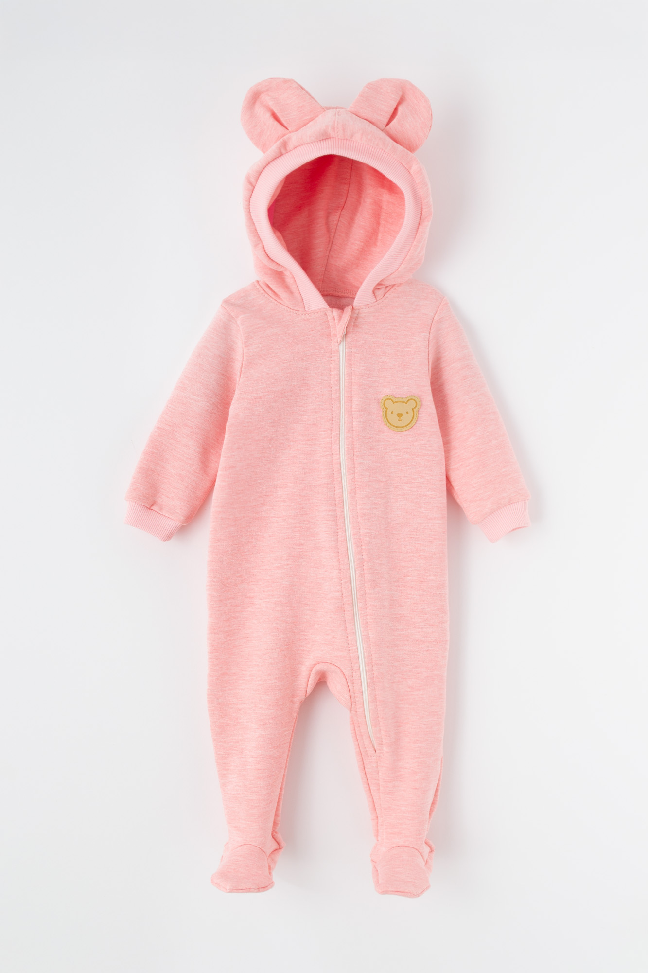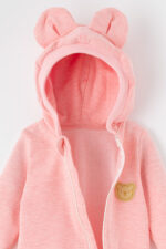 Uroczy kombinezon dla niemowląt w kolorze pastelowego różu, wykonany z miękkiej, przyjemnej w dotyku tkaniny. Model posiada kaptur z ozdobnymi uszkami, nadającymi mu słodkiego charakteru, oraz praktyczny suwak biegnący po skosie – ułatwiający ubieranie maluszka. Na piersi znajduje się delikatna naszywka z wizerunkiem misia. Kombinezon ma zabudowane stópki, dzięki czemu zapewnia dziecku ciepło i wygodę. Idealny na chłodniejsze dni lub jako piżamka do spania.