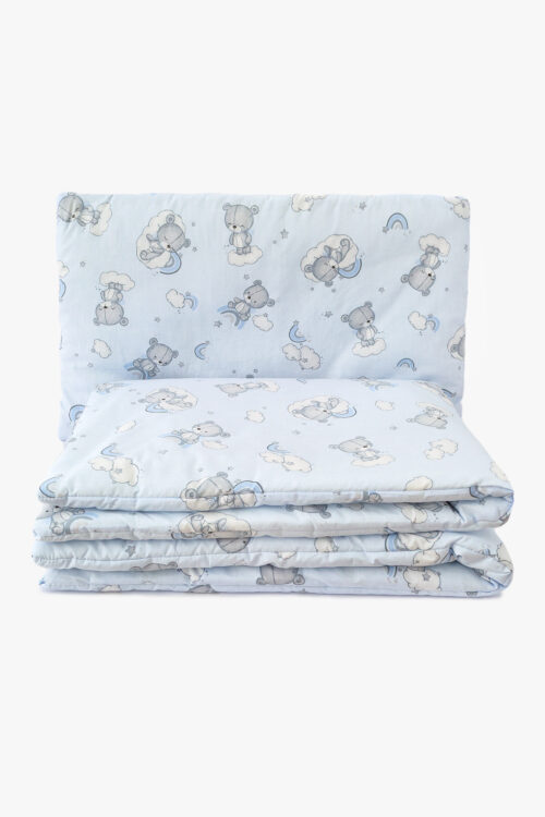 Przytulna pościel dziecięca z wypełnieniem w motywach szarych misiów na błękitnym tle. Wzór z słodkimi misiątkami, tęczami, chmurkami i gwiazdkami tworzy spokojną, senną atmosferę sprzyjającą relaksowi. Komplet zawiera kołderkę 80x100cm oraz poduszkę 40x60cm z antyalergicznym wypełnieniem. Poszycie ze 100% bawełny, wypełnienie z włókniny antyalergicznej. Idealny dla chłopczyka.