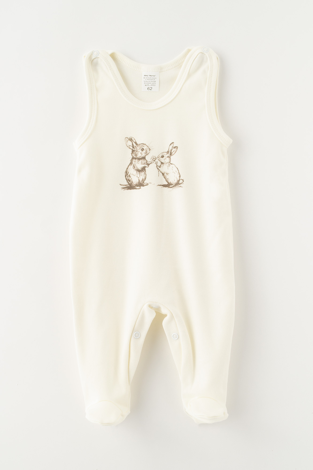 Eleganță clasică în versiune pentru bebeluși. Acest costumaș de culoare crem cald este o piesă de bază în garderobă, ideal pentru orice ocazie. Fabricat dintr-un material moale, oferă micuțului libertate completă și confort termic. Pe piept se află o grafică adorabilă, desenată, cu doi iepurași care își împart un floricel. Este un model delicat care adaugă farmec nostalgic și natural hăinuței. Bumbac 100%.