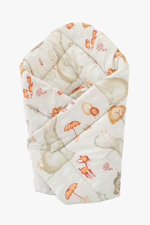 Czarujący wzorzysty rożek niemowlęcy z motywami leśnych zwierzątek na kremowym tle. Obie strony prezentują słonie, lisy, zajączki wśród jesiennych drzew i grzybków w naturalnych kolorach. Rozmiar 75x75cm. Materiał: 100% bawełna, wypełnienie włóknina antyalergiczna. Doskonały dla miłośników natury.