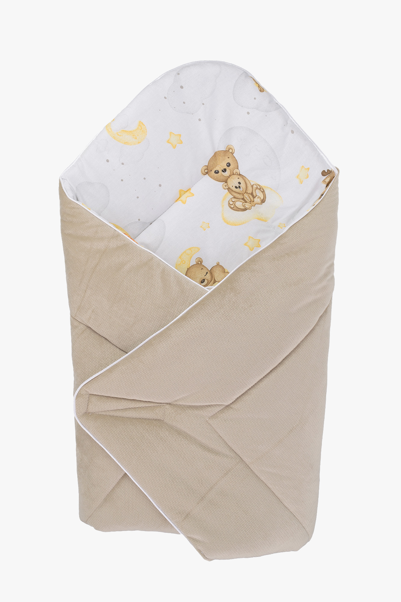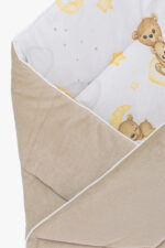 Zapewnij swojemu maluszkowi komfort i bezpieczeństwo dzięki temu eleganckiemu rożkowi w odcieniu beżu. Delikatny wzór misiów i gwiazdek nadaje mu wyjątkowego uroku, idealnego dla niemowląt już od pierwszych chwil życia.