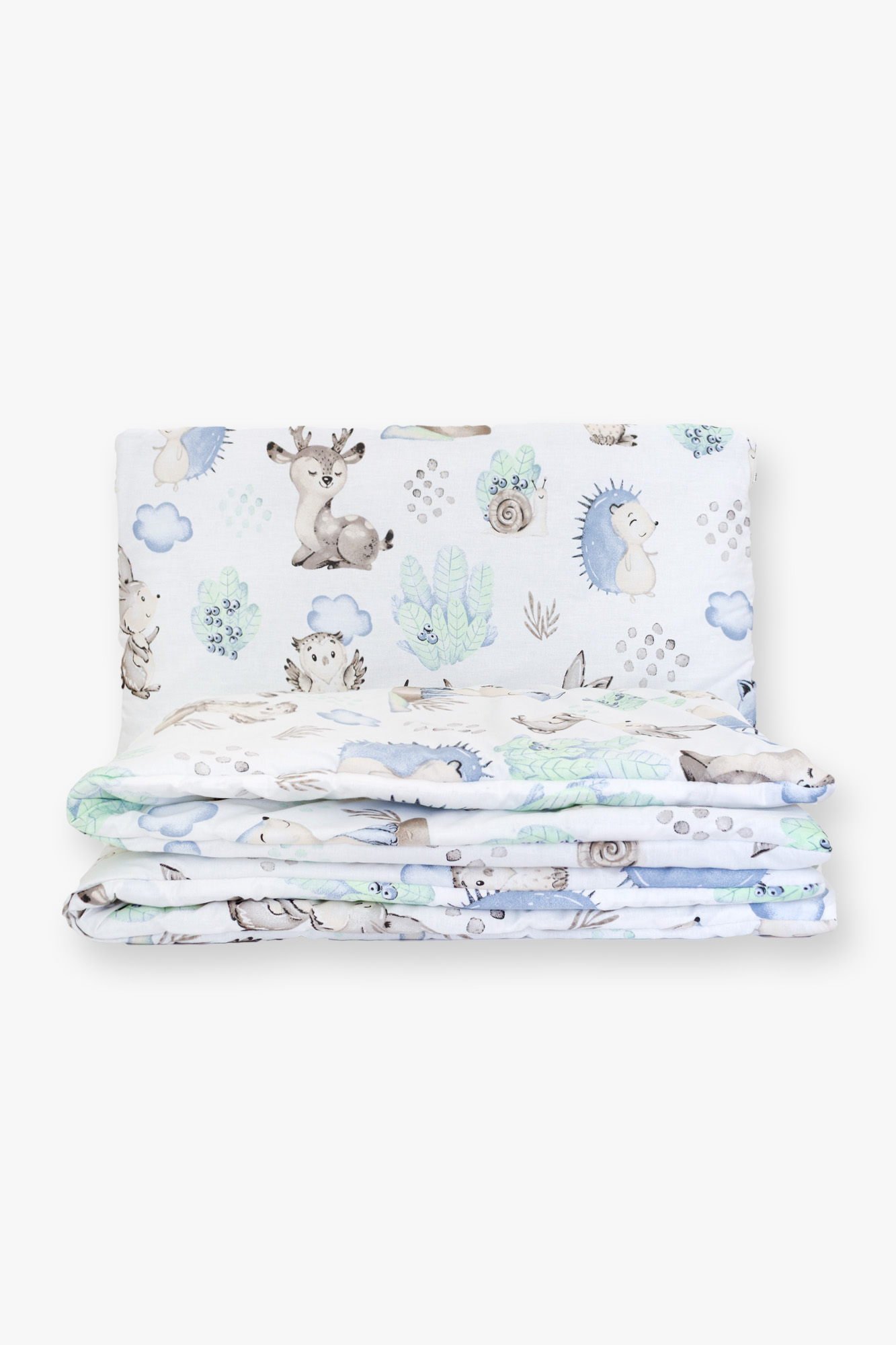 Czarująca pościel dziecięca z wypełnieniem z motywami leśnych zwierzątek na białym tle. Wzór przedstawia sarenki, lisy i jeże wśród leśnych krzewów. Komplet zawiera kołderkę 80x100cm oraz poduszkę 40x60cm z antyalergicznym wypełnieniem. Poszycie wykonane ze 100% bawełny, wypełnienie z włókniny antyalergicznej. Doskonały dla miłośników natury.