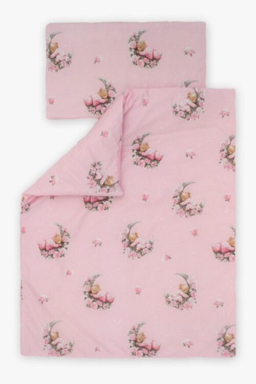 Czarująca pościel z motywem uroczych misiów. Wzór przedstawia słodkie misie śpiące na księżycu, które tworzą przytulną atmosferę. Komplet zawiera poszwę na kołdrę 90x120cm oraz poszewkę na poduszkę 40x60cm.