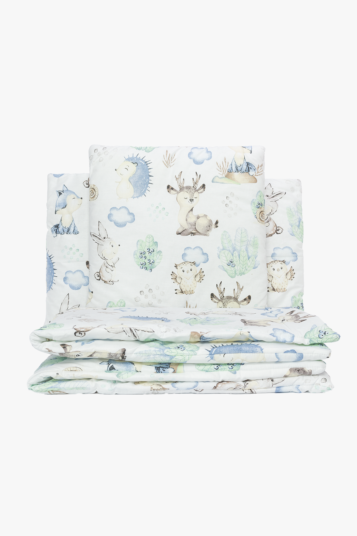 Mięciutki zestaw pościeli z wszytym wypełnieniem, czyli kołderka i poszewka w jednym! Kołderka z dwoma płaskimi poduszkami dwustronnie bawełniane i z antyalergicznym wypełnieniem.Wszystko można prać razem. W skład kompletu wchodzi -kołderka80cm/100cm -poduszka płaska 40cm/60cm -poduszka płaska 40cm/40cm Bardzo fajny kolorowy komplet pościeli dla malutkiego dziecka.