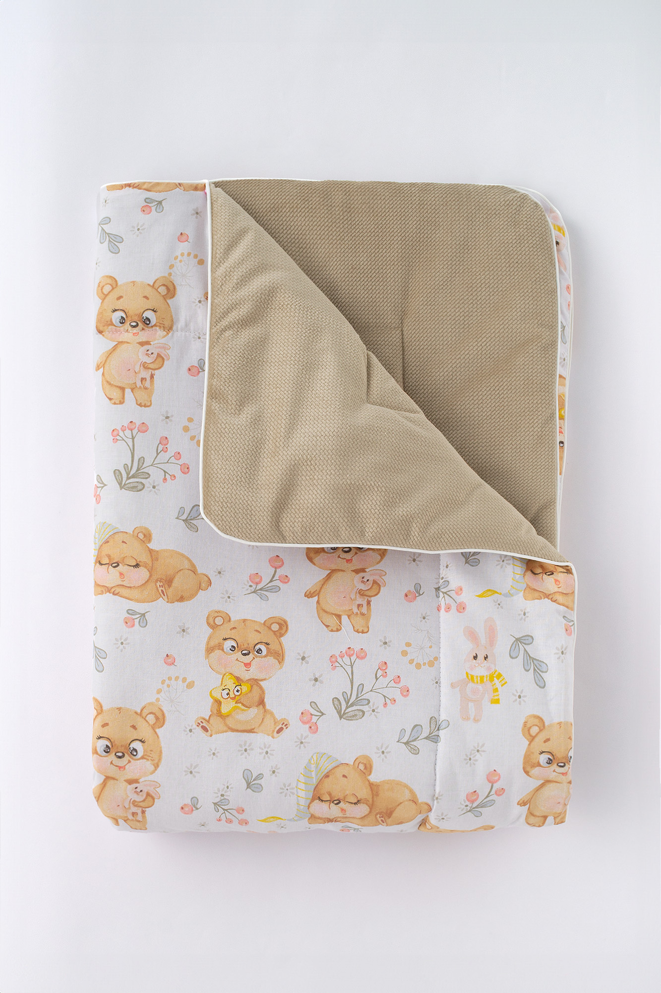 Uroczy dwustronny kocyk z motywem słodkich misiów w odcieniach beżu i żółci. Wzór zawiera pluszowe misie z okularkami, miodkiem oraz delikatne kwiatuszki i białe króliczki. Druga strona wykonana z miękkiego beżowego velvet. Rozmiar 75x100cm. Materiał: strona tkaninowa 100% bawełna, strona velvetowa 100% poliester, wypełnienie włóknina antyalergiczna. Ciepłe kolory tworzą przytulną atmosferę.