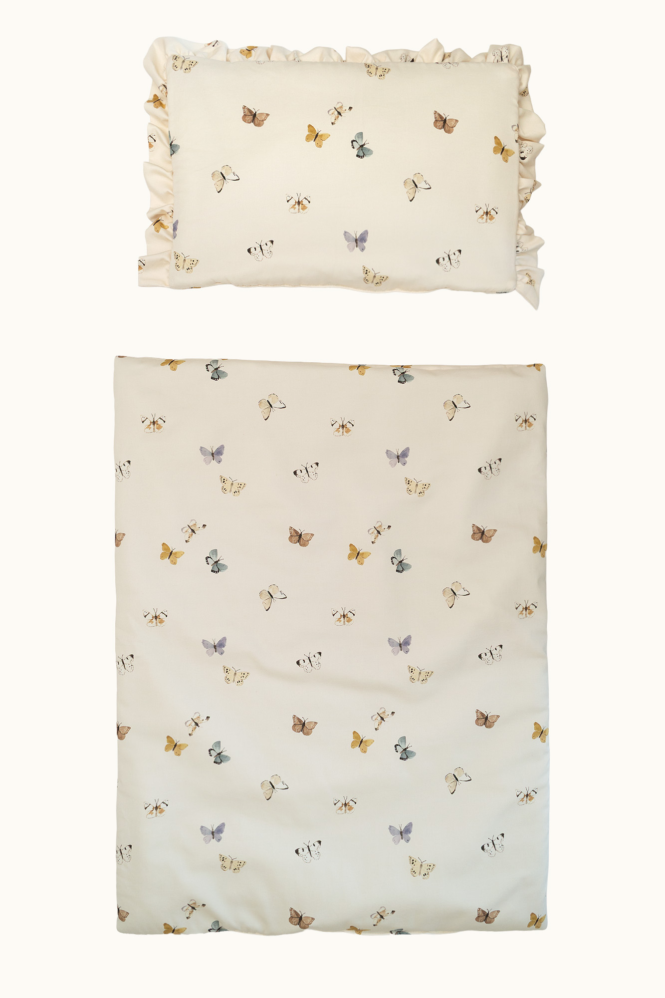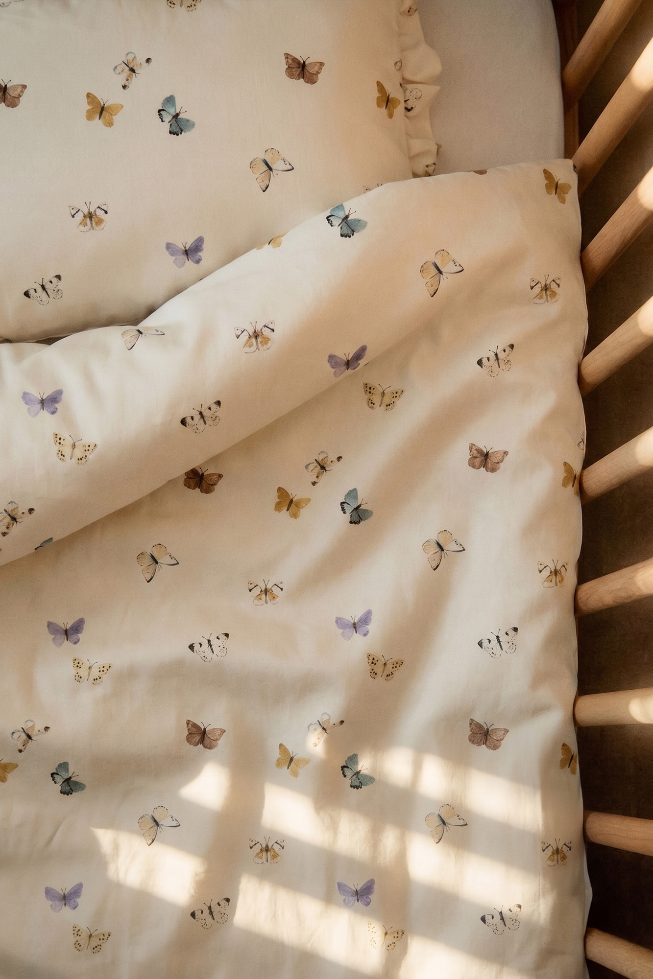Delikatna pościel dziecięca ozdobiona subtelnym wzorem kolorowych motyli, utrzymana w jasnej, kremowej tonacji. Wykonana z miękkiej i oddychającej tkaniny, zapewnia komfortowy i spokojny sen maluszka. Urocza falbanka przy poduszce dodaje całości lekkości i elegancji, tworząc przytulną, bajkową atmosferę w pokoju dziecka. Przyjazna dla wrażliwej skóry, idealna na co dzień już od pierwszych chwil życia.