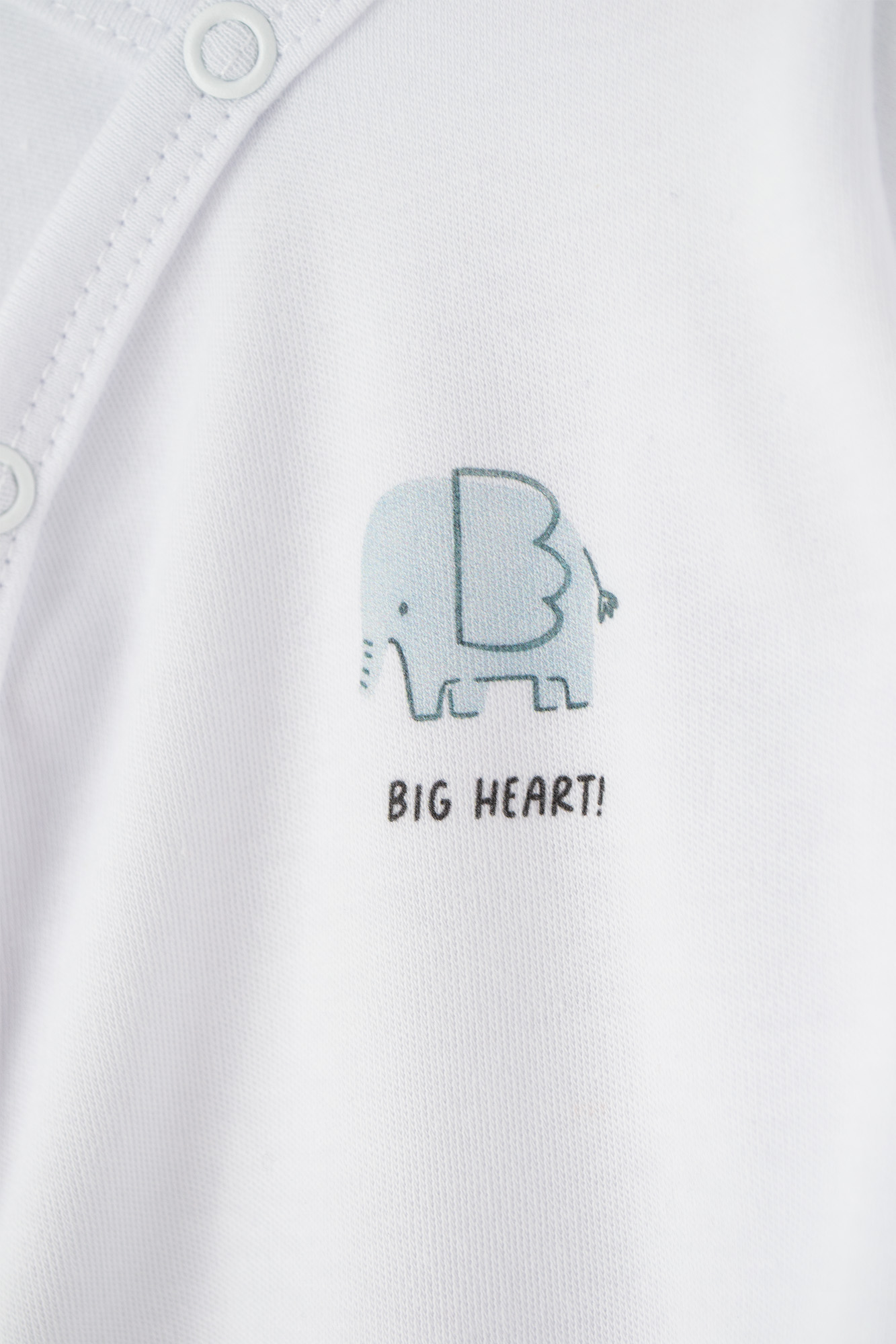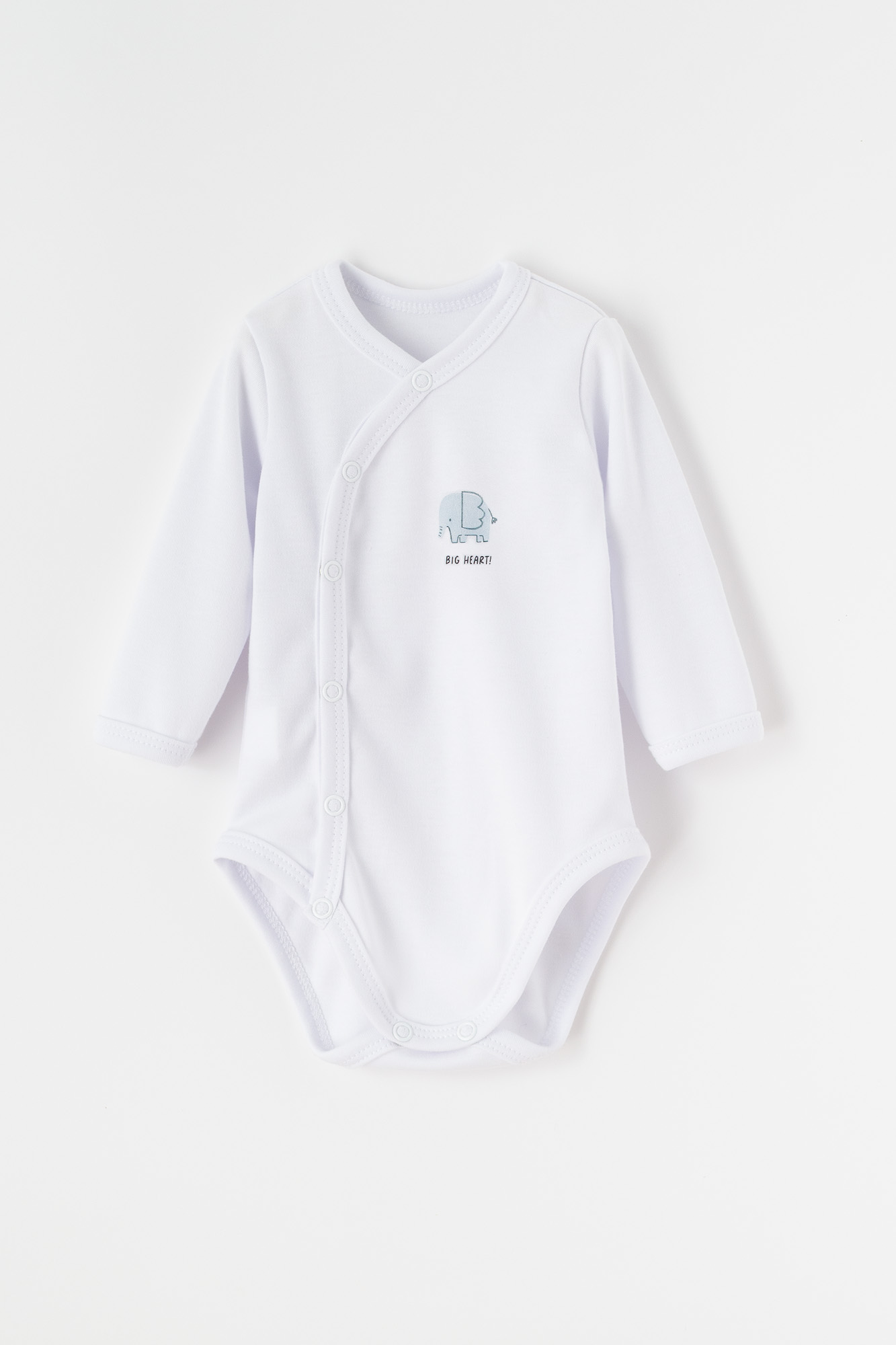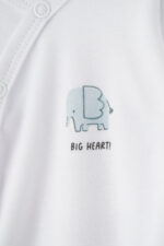 Miękkie i wygodne body niemowlęce wykonane z delikatnej, oddychającej bawełny. Kopertowe zapięcie na napy po całej długości ułatwia przebieranie maluszka, zapewniając jednocześnie komfort i bezpieczeństwo. Na przodzie znajduje się subtelny nadruk niebieskiego słonika z napisem „BIG HEART!”, który dodaje ubranku uroczego charakteru.