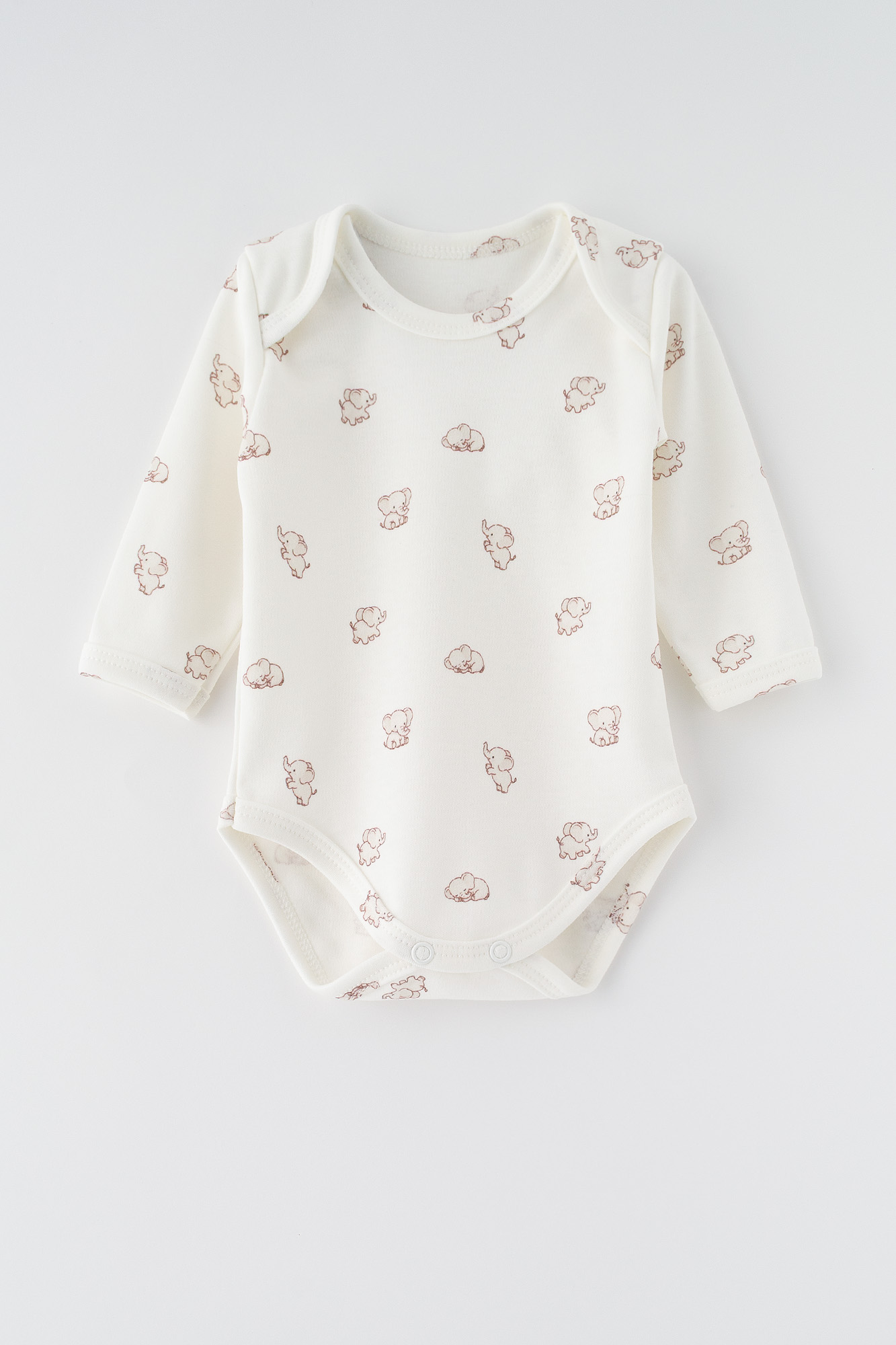Urocze body niemowlęce z długim rękawem w kolorze ecru, ozdobione delikatnym, powtarzającym się wzorem w słoniki. Body wykonane jest z miękkiej, przyjemnej w dotyku dzianiny bawełnianej, która zapewnia komfort i delikatność dla wrażliwej skóry malucha. Posiada wygodny, okrągły dekolt z poszerzonym wykończeniem typu kopertowego, ułatwiającym zakładanie przez główkę dziecka. Rękawy zakończone są delikatnymi ściągaczami, które dobrze przylegają do nadgarstków. W dolnej części body znajdują się praktyczne zapięcia na napy, umożliwiające szybką i wygodną zmianę pieluszkę. Klasyczny, minimalistyczny design w połączeniu z uroczym motywem zwierzęcym sprawia, że body idealnie nadaje się zarówno jako codzienna baza ubraniowa, jak i uroczy element wyprawki. Doskonały pomysł na prezent dla noworodka lub niemowlaka.
