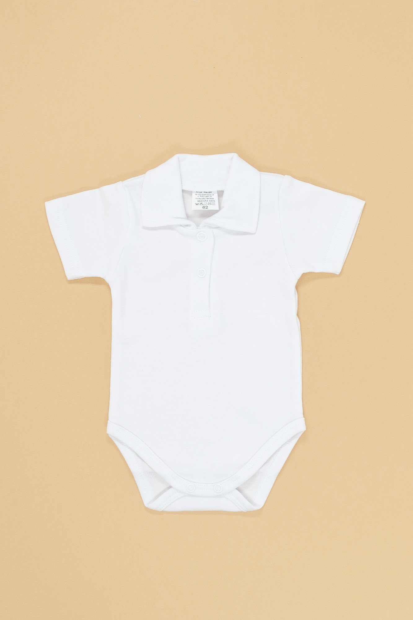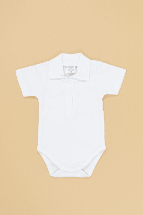 Białe body z 100% bawełny z kołnierzykiem dla chłopca.Zapinane na napki z krótkim rękawkiem.