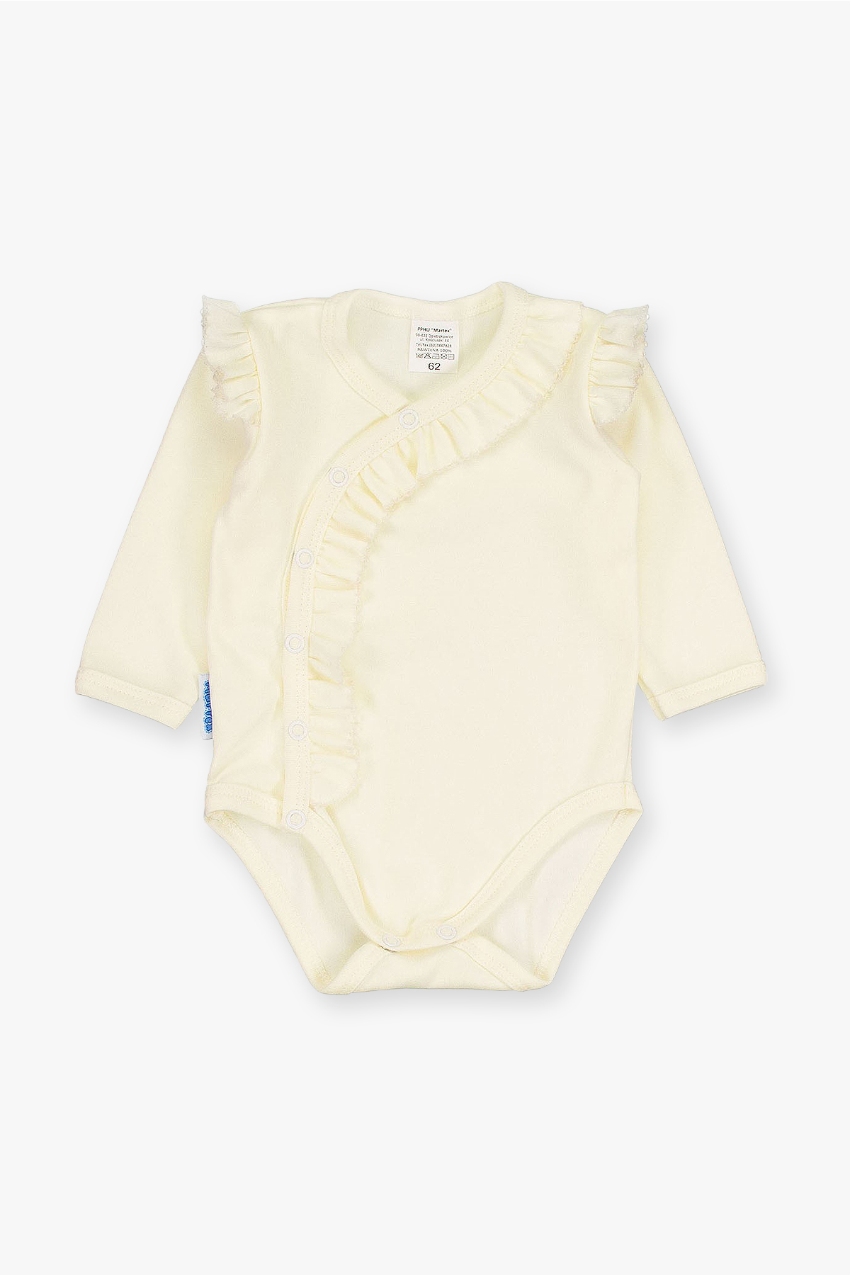 Body kopertowe z 100% bawełny , całe rozpinane, zapinane na napki .W body kopertowe bardzo dobrze ubiera się malutkie dziecko, zwłaszcza na początku pierwszych miesięcy. Body ozdobione falbanką