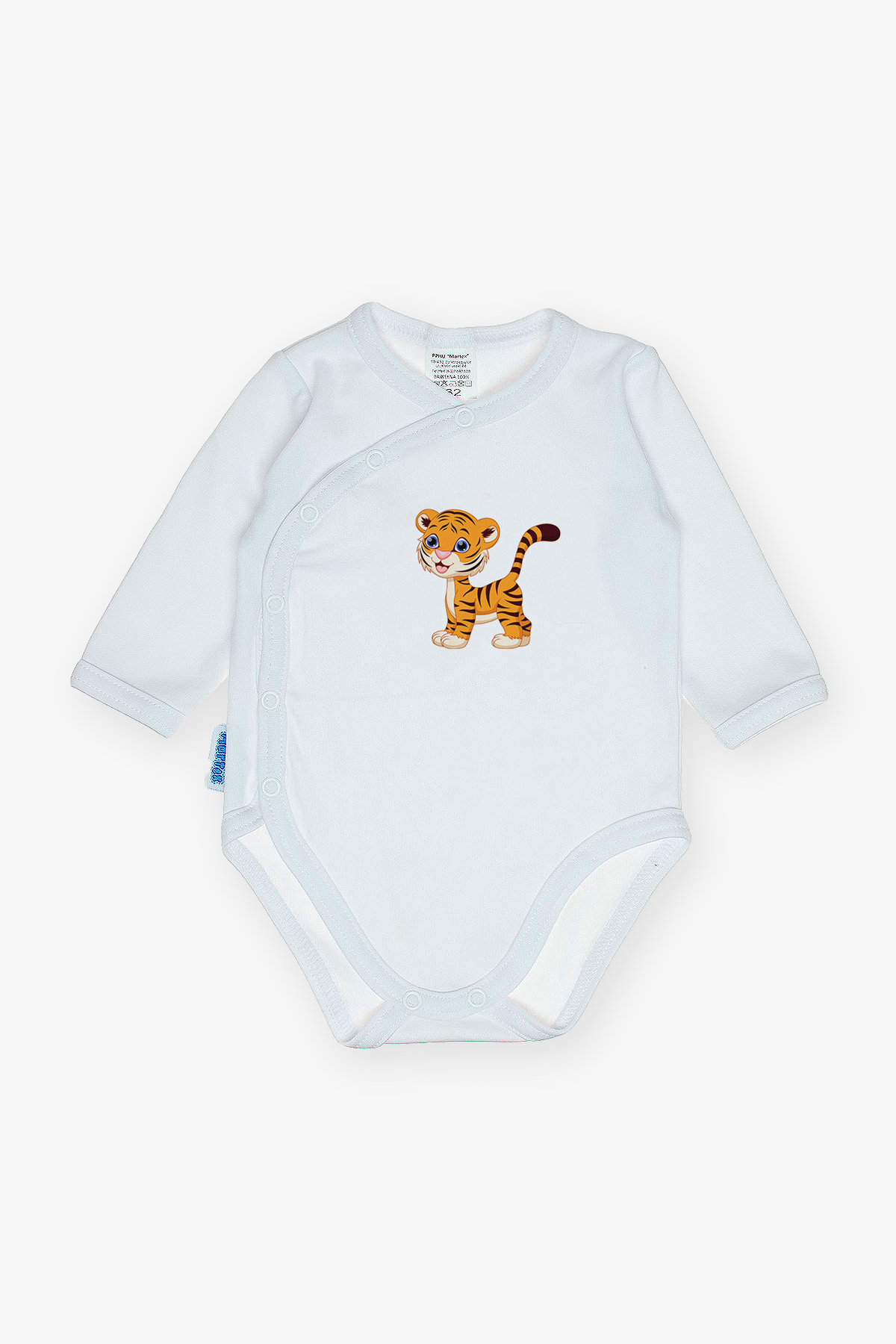 Białe body kopertowe z 100% bawełny zapinane na bezniklowe napki. Ozdobione kolorowym obrazkiem