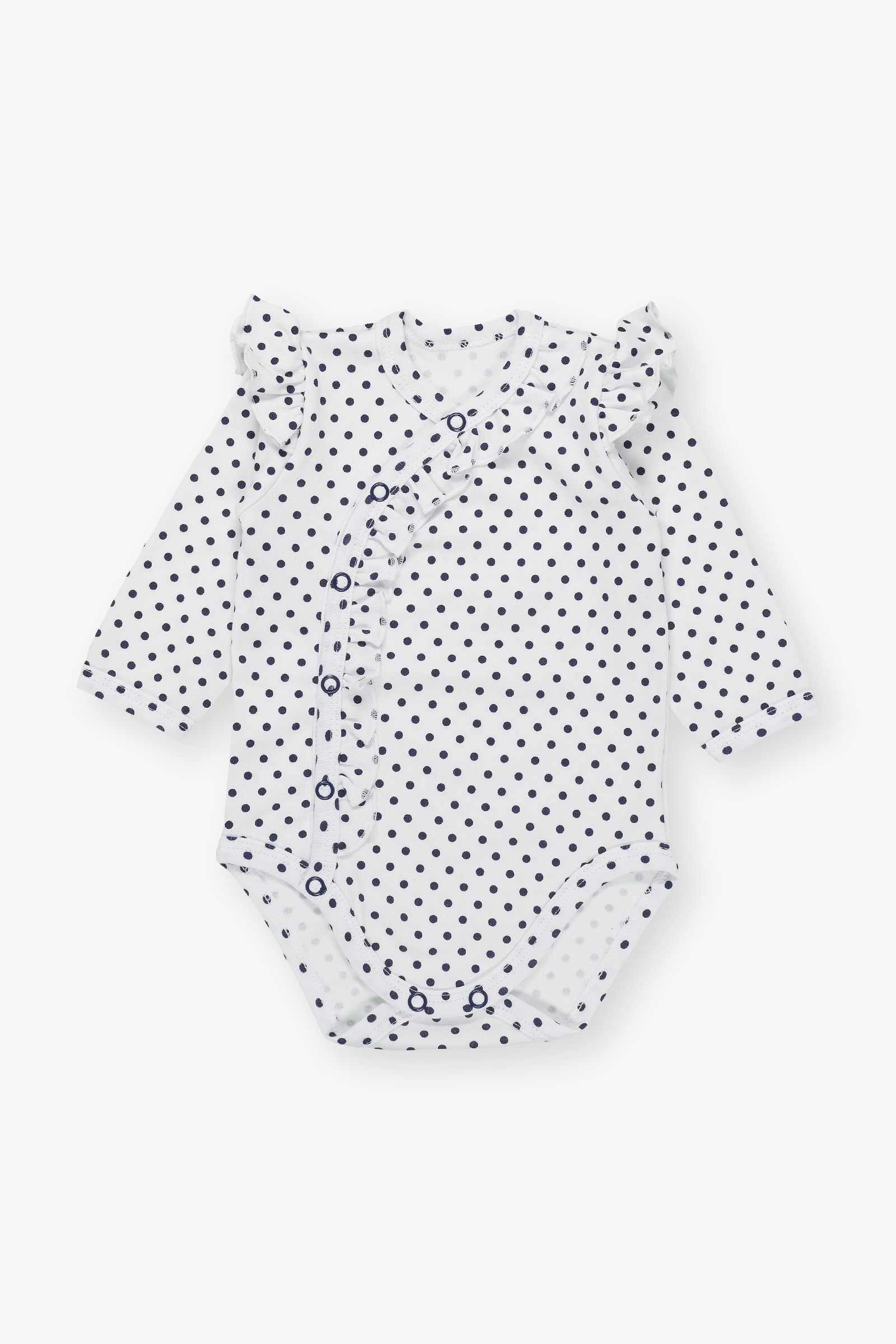 Body kopertowe z 100% kolorowej bawełny ,ozdobione falbanką, całe rozpinane, zapinane na napki .W body kopertowe bardzo dobrze ubiera się malutkie dziecko, zwłaszcza na początku pierwszych miesięcy. Z tej kolekcji jest pajacyk, czapeczka,śpioszki, kaftanik kopertowy i komplet body z półśpiochem.