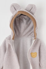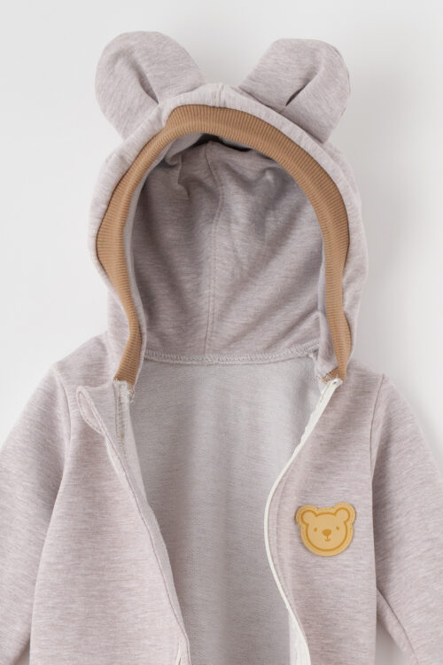 Przytulny kombinezon dla niemowląt w kolorze beżowym, wykonany z miękkiej, elastycznej tkaniny, delikatnej dla wrażliwej skóry dziecka. Model posiada kaptur z uroczymi uszkami oraz kontrastowe ściągacze w kolorze karmelowym, które dodają mu stylowego charakteru. Na piersi znajduje się naszywka z wizerunkiem misia w dopasowanym odcieniu. Kombinezon zapinany jest na zamek błyskawiczny biegnący po skosie, co ułatwia ubieranie i przewijanie. Zabudowane stópki zapewniają ciepło i wygodę, dzięki czemu kombinezon doskonale sprawdzi się zarówno w domu, jak i na spacerze w chłodniejsze dni.