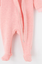 Uroczy kombinezon dla niemowląt w kolorze pastelowego różu, wykonany z miękkiej, przyjemnej w dotyku tkaniny. Model posiada kaptur z ozdobnymi uszkami, nadającymi mu słodkiego charakteru, oraz praktyczny suwak biegnący po skosie – ułatwiający ubieranie maluszka. Na piersi znajduje się delikatna naszywka z wizerunkiem misia. Kombinezon ma zabudowane stópki, dzięki czemu zapewnia dziecku ciepło i wygodę. Idealny na chłodniejsze dni lub jako piżamka do spania.