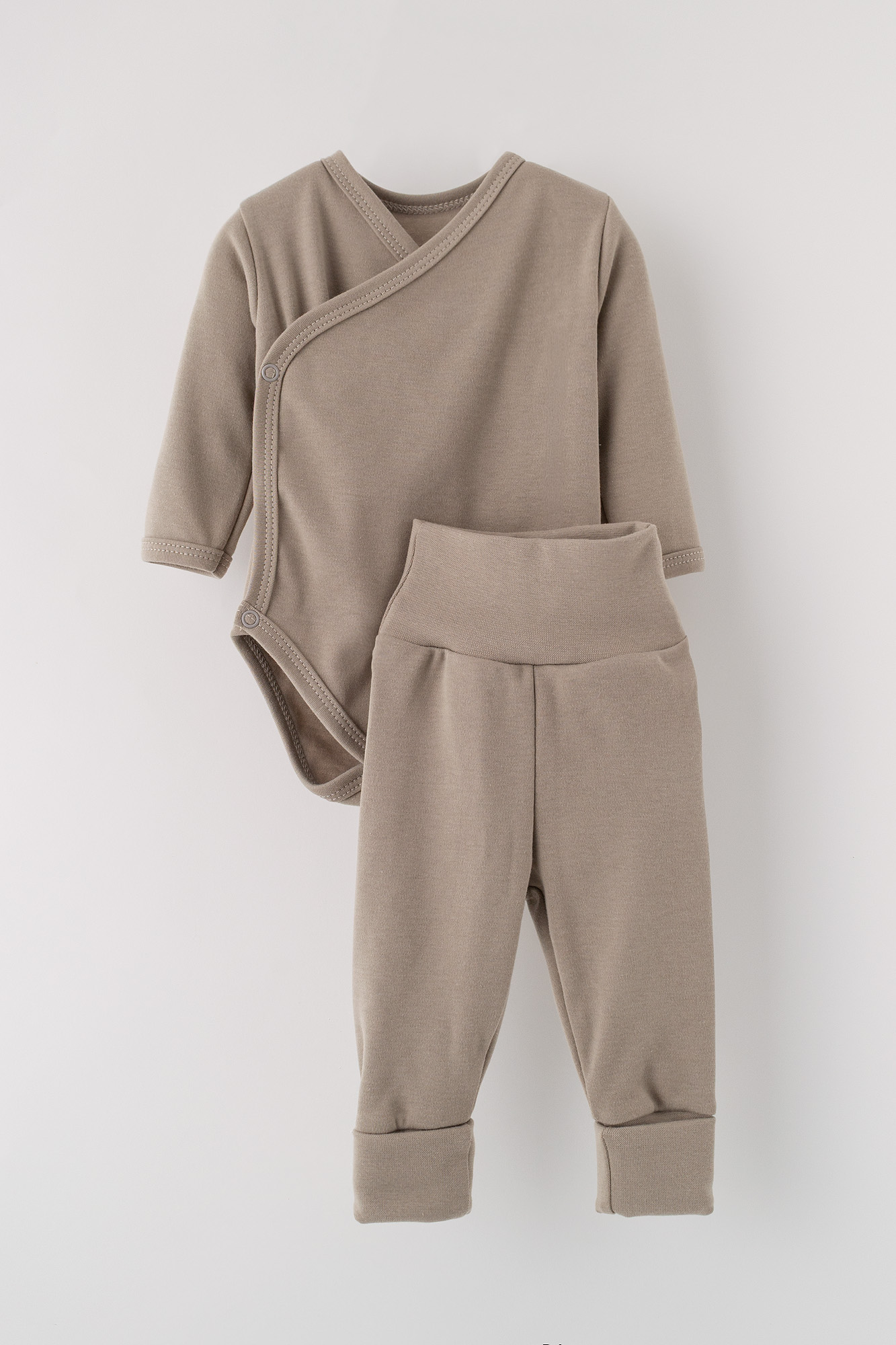 Stylowy i ponadczasowy komplet niemowlęcy w naturalnym, ciepłym odcieniu beżu. Zestaw składa się z body kopertowego z długim rękawem oraz wygodnych legginsów z szerokim pasem. Idealny wybór dla rodziców ceniących minimalizm, komfort i wysoką jakość.
