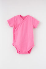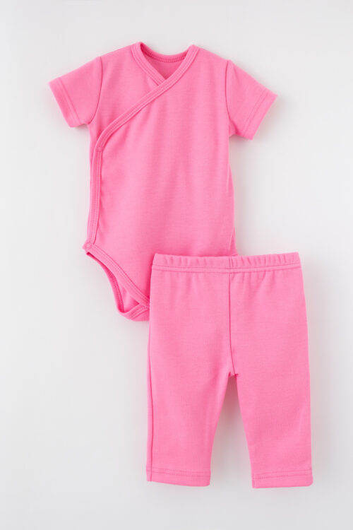 Uroczy komplet niemowlęcy w pastelowym różowym kolorze. Zestaw składa się z body kopertowego z krótkim rękawem oraz dopasowanych spodenek. Body zapinane na napy z boku, co ułatwia ubieranie maluszka. Spodenki z elastyczną talią zapewniają komfort noszenia. Wykonane z miękkiej, przewiewnej bawełny idealnej dla delikatnej skóry dziecka. Doskonały na ciepłe dni.