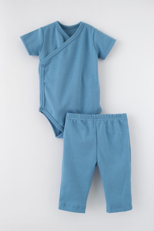 Klasyczny komplet niemowlęcy w spokojnym niebieskim kolorze. Komplet składa się z body kopertowego z krótkim rękawem oraz dopasowanych spodenek. Body z praktycznym zapięciem z boku na zatrzaski. Spodenki z delikatnej dzianiny z elastyczną talią. Wykonane z certyfikowanej bawełny przyjaznej dla skóry maluszka. Ponadczasowy design i wysoka jakość wykonania.