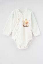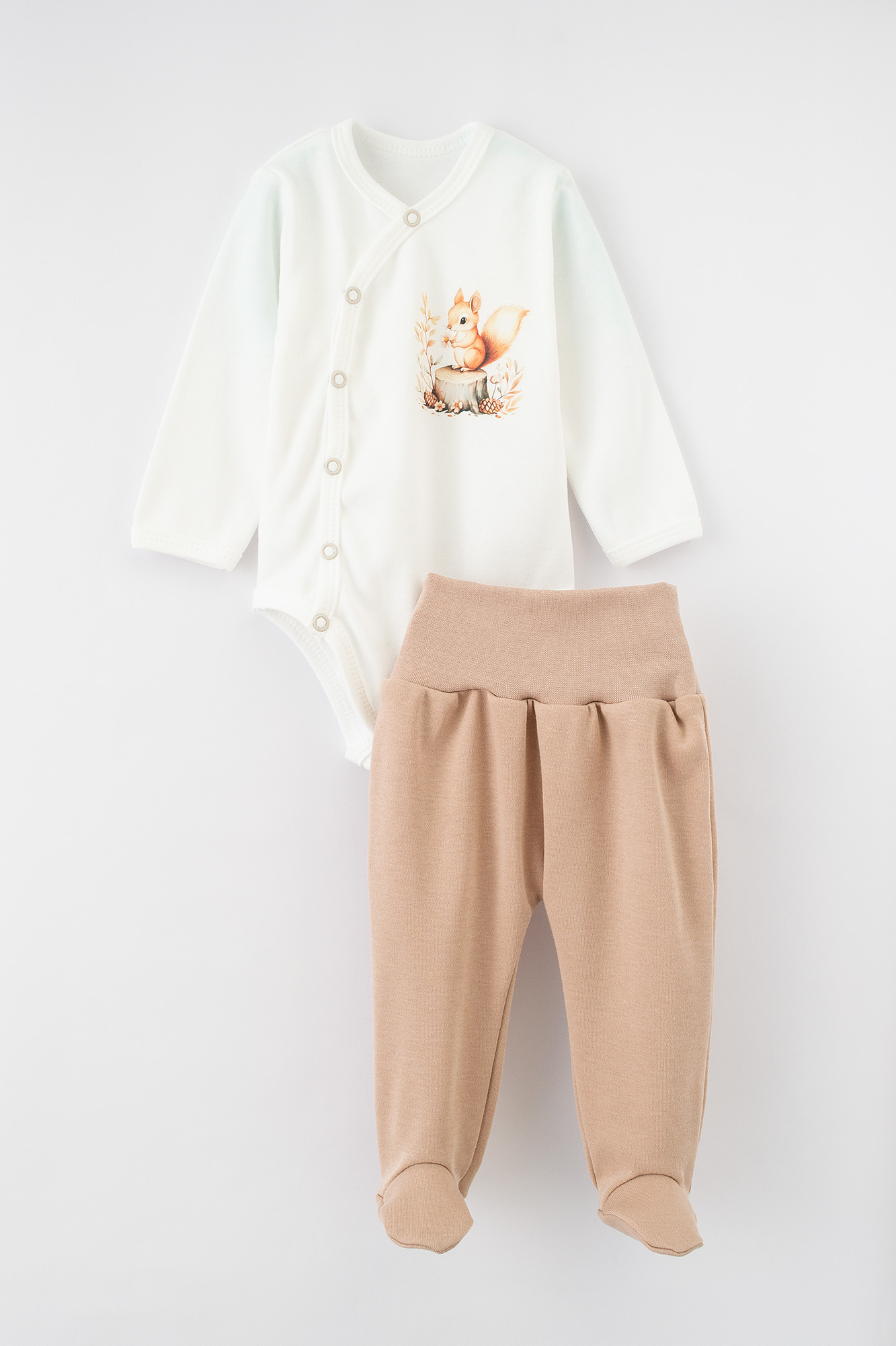 Uroczy komplet niemowlęcy idealny dla maluszka od pierwszych dni życia. Zestaw składa się z długiego rękawa body w kolorze ecru z uroczym nadrukiem wiewiórki oraz beżowych półśpiochów ze stópkami.