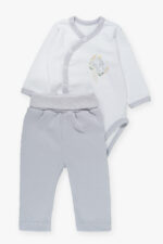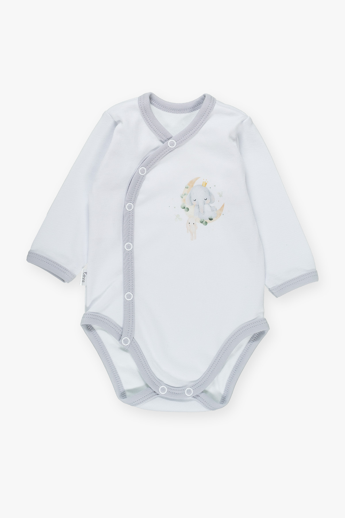Komplet niemowlęcy składający się z bodów całych rozpinanych i połśpioszków Komplet niemowlęcy składający się z bodów całych rozpinanych ozdobionych sitodrukiem i spodenek. Body zapinane na napki,spodenki z szerokim pasem ,który nie uciska dziecko w brzuszek. Całość wykonanna z 100% bawełny.