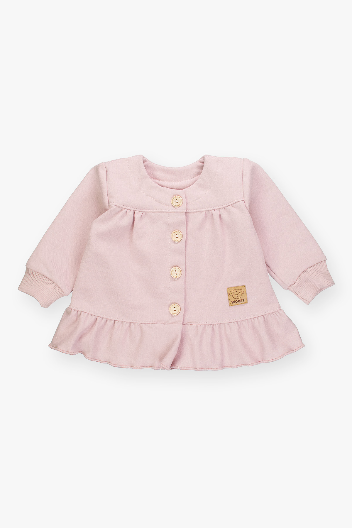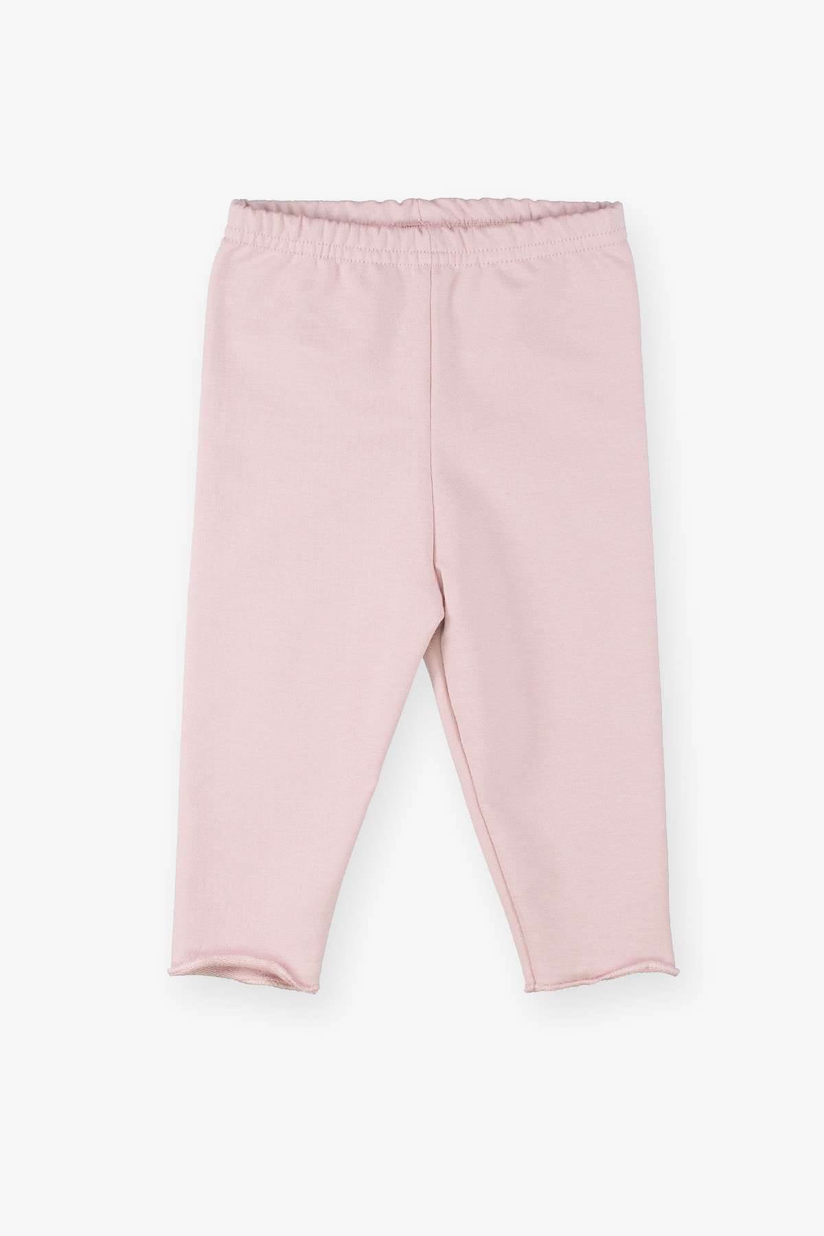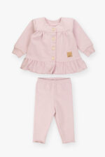 Komplet dla dziewczynki z dresówki bawełnianej z elastanem w sam raz na sezon wiosenno letni. Bluza w kształcie tuniki lekko przymarszczona,na dole wykończona baskinką. Zapinana na drewniane guziczki. Do bluzy leginsy na gumce wykończone na dole mereszką.