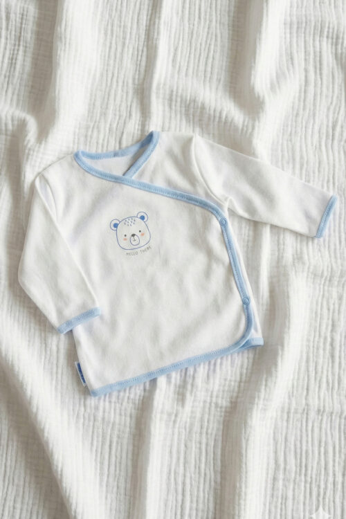 Koszulka kopertowa zapinana na napki, ozdobiona obrazkiem. Wykonana z 100% bawełny. Bardzo wygodna w ubieraniu noworodka.