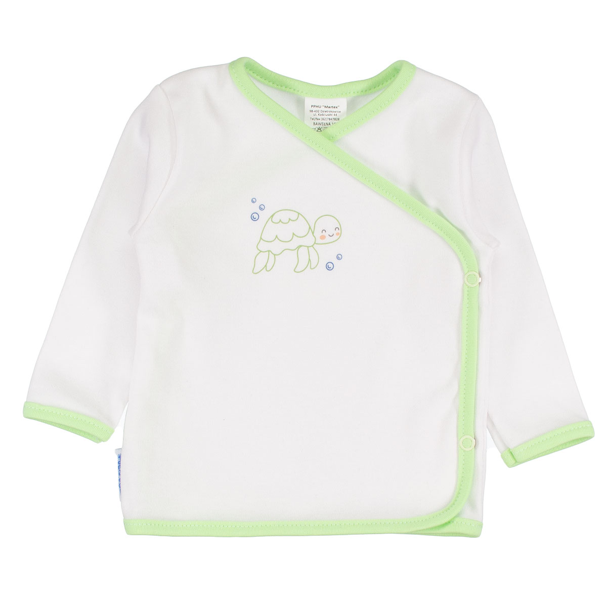 Koszulka kopertowa zapinana na napki, ozdobiona obrazkiem. Wykonana z 100% bawełny. Bardzo wygodna w ubieraniu noworodka.