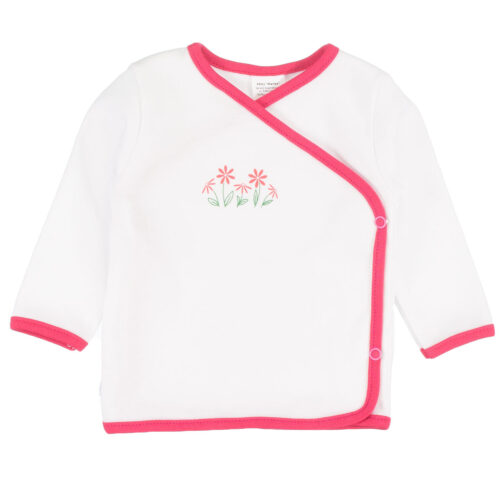 Koszulka kopertowa zapinana na napki, ozdobiona obrazkiem. Wykonana z 100% bawełny. Bardzo wygodna w ubieraniu noworodka.