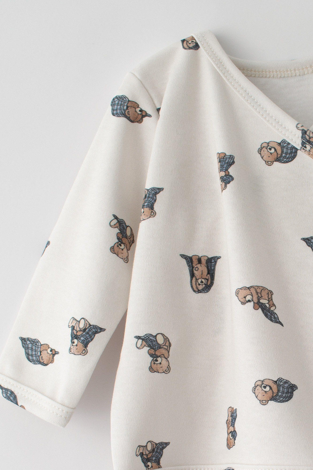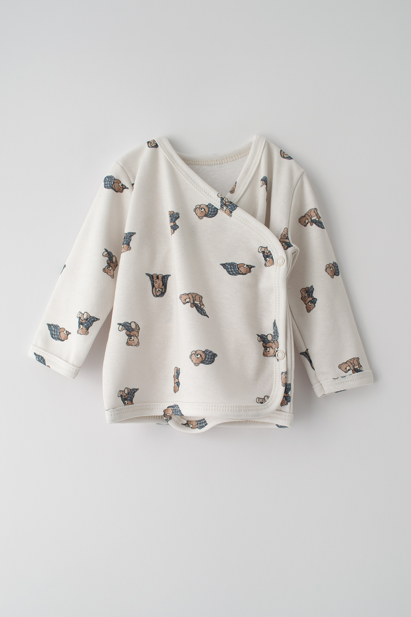 Urocza koszulka niemowlęca w kolorze śmietankowym, wykonana z miękkiej i przewiewnej bawełny. Całość pokryta delikatnym drukiem w brązowe niedźwiadki. Klasyczny, swobodny krój z długim rękawem, który zapewnia dziecku komfort ruchów. Neutralna kolorystyka sprawia, że koszulka pasuje do każdej stylizacji i jest odpowiednia zarówno dla chłopców, jak i dziewczynek.