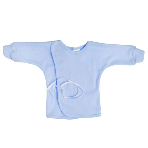Koszulka niemowlęca z mięciutkiej 100% bawełny. Na ramionku zapinan na napkę, na boku zawiązywana na delikatne troczki aby nic nie uciskało dziecko w jego pierwszych dniach życia. Rękawki zakończone mankietami.