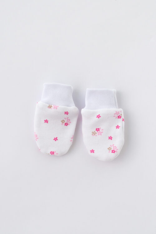 Delikatne rękawiczki dla noworodka chroniące przed zadrapaniami. Wzór w różowe kwiatki na białym tle. Elastyczny, miękki mankiet przy nadgarstku zapewniający komfort. Niezbędne w pierwszych tygodniach życia maluszka. Materiał: 100% bawełna.