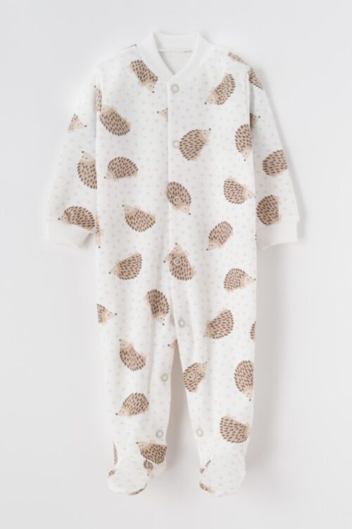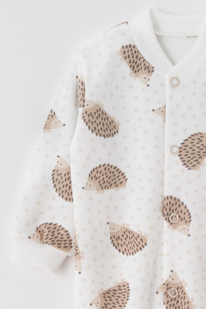 Miękki i wygodny pajacyk dla niemowląt wykonany z wysokiej jakości bawełny, idealny do snu i codziennego noszenia. Uroczy wzór w jeżyki w odcieniach beżu i brązu nadaje ubranku przytulny, naturalny wygląd. Model w kolorze ecru posiada praktyczne zapięcie na napy biegnące przez całą długość, co ułatwia ubieranie i przewijanie maluszka. Zabudowane stópki zapewniają ciepło i komfort, a delikatne ściągacze przy rękawach zapobiegają podwijaniu.