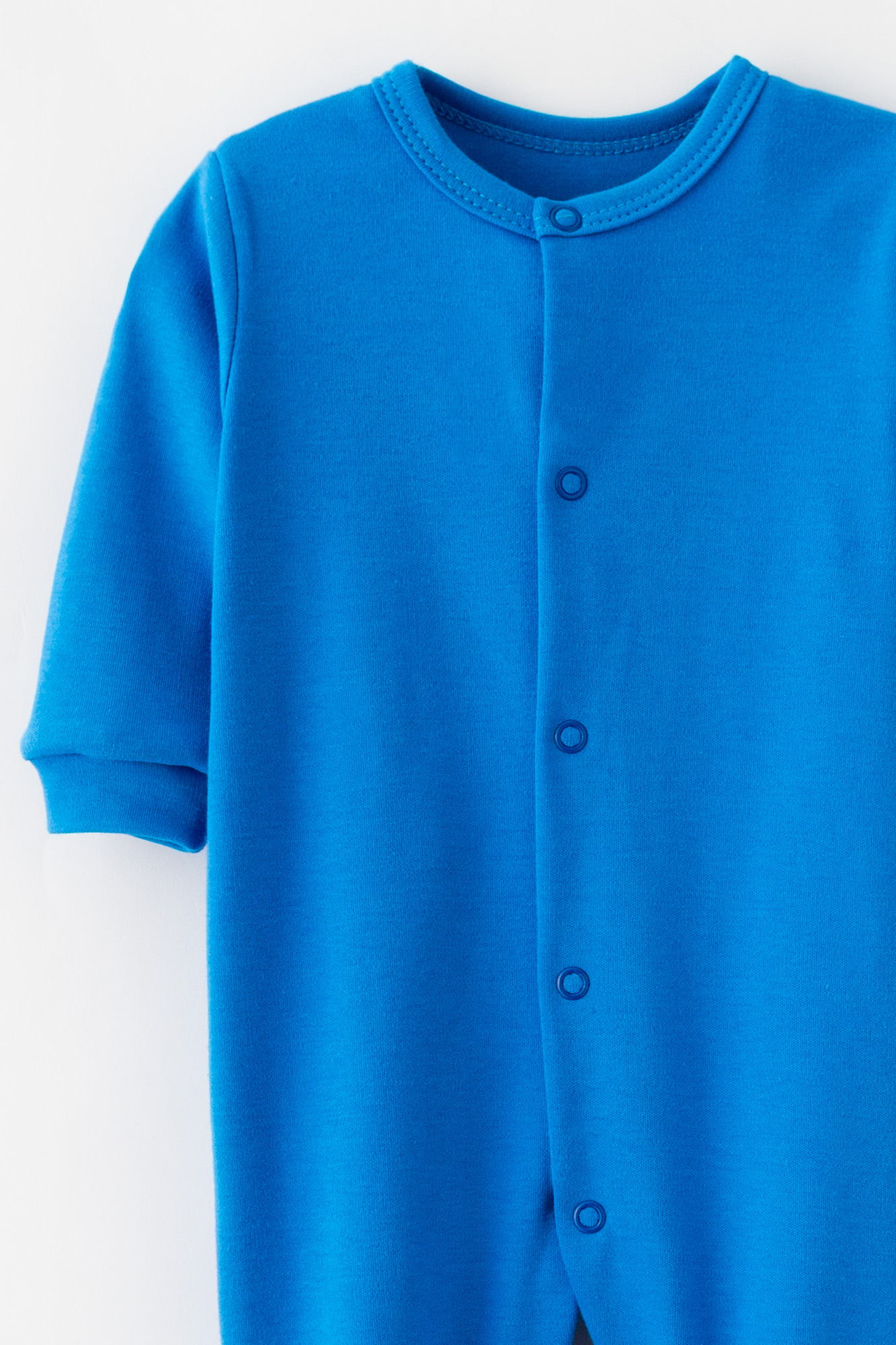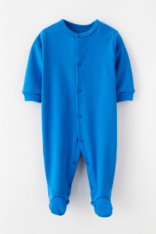 Niemowlęcy pajacyk do spania z gładkiej miękkiej 100% bawełny. Cały zapinany na napki. Rękawki zakończone mankiecikiem.