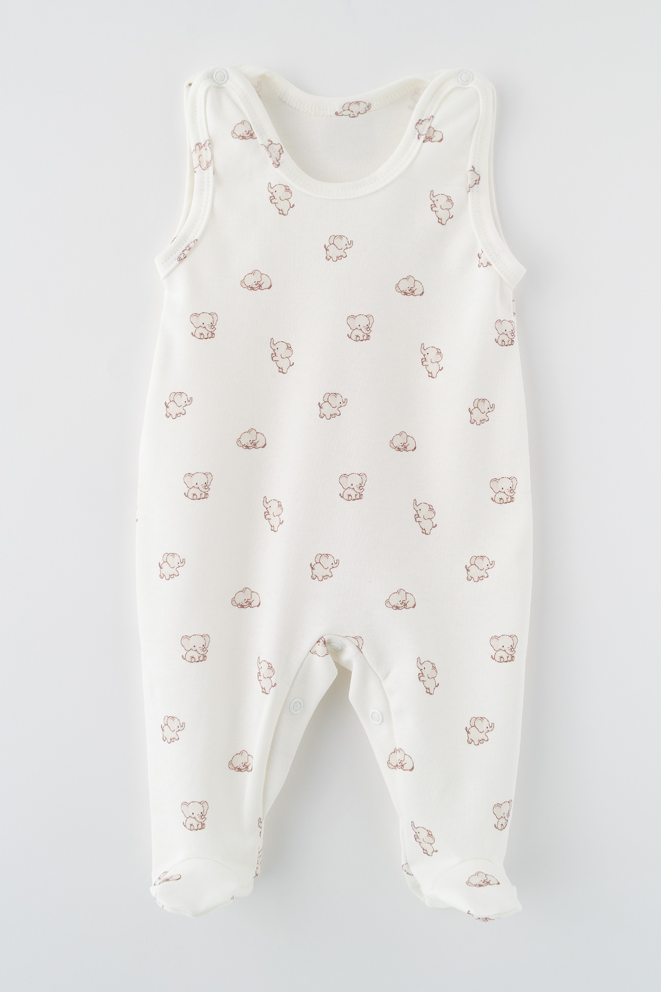 Urocze śpioszki niemowlęce w kolorze białym (ecru) z delikatnym, powtarzającym się wzorem przedstawiającym małe słoniki. Śpioszki mają klasyczny krój bez rękawów, z okrągłym dekoltem wykończonym miękką lamówką, co zapewnia wygodę i komfort dla delikatnej skóry dziecka. Na ramionach znajdują się praktyczne zapięcia na napy, ułatwiające zakładanie i zdejmowanie ubranka. Dolna część śpioszków jest zakończona zamkniętymi stopkami, które chronią małe stópki przed chłodem. W kroku zastosowano dodatkowe zapięcie na napy, co znacznie ułatwia przewijanie malucha. Wykonane z miękkiej, przyjemnej w dotyku dzianiny bawełnianej, idealnej dla noworodków i niemowląt. Neutralna kolorystyka sprawia, że śpioszki świetnie sprawdzą się zarówno dla dziewczynek, jak i chłopców. Doskonały wybór jako codzienna odzież domowa lub element wyprawki niemowlęcej.