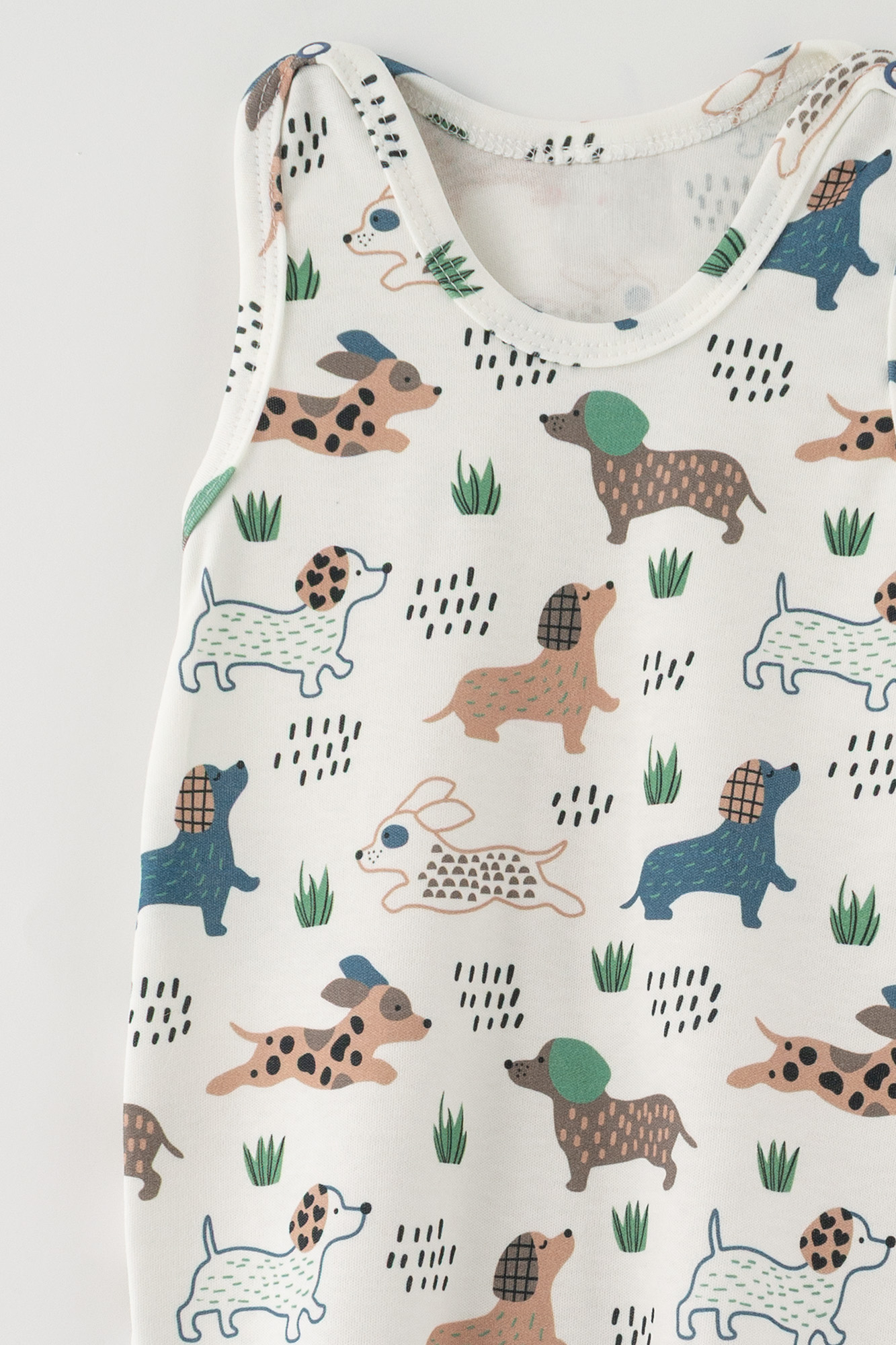 Klasyczny śpioch niemowlęcy z motywem piesków. Miękki materiał idealny do snu.