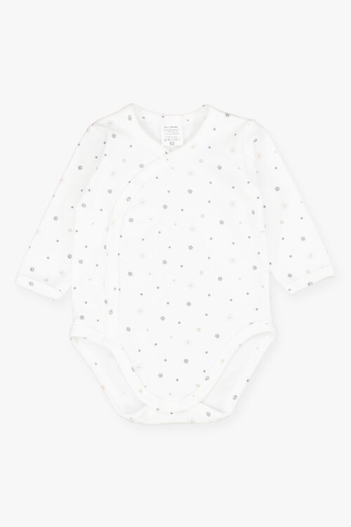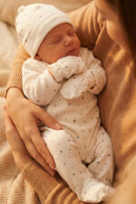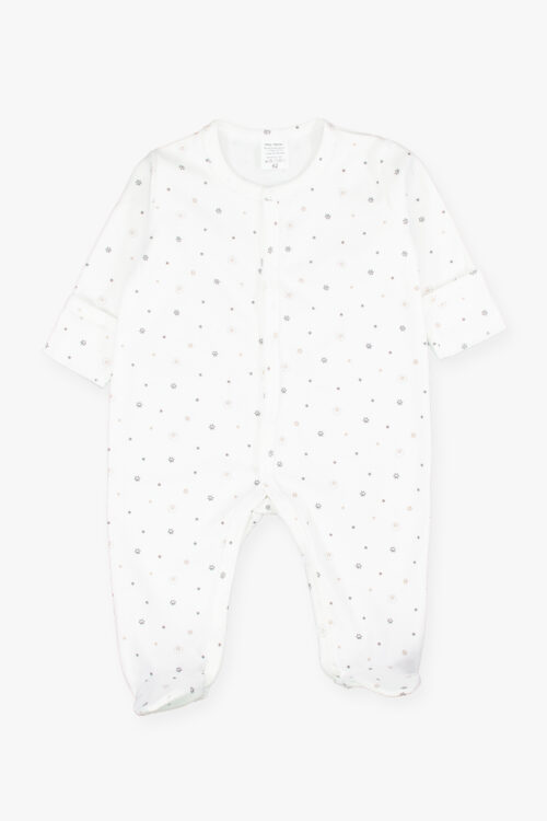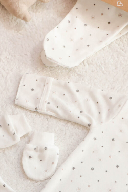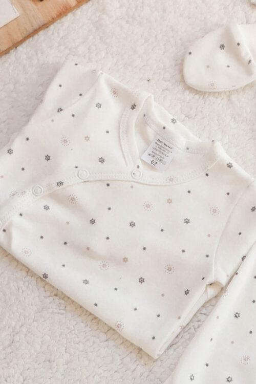 Pierwsza wyprwka dla maleństwa.Uszyta z mięciutkiej 100% bawełny w delikatne gwiazdeczki. Wszystko zapinane na bezniklowe napy.Wszystko zapakowane w ładne pudełko. W skład wyprawki wchodzi 1)pajacyk z łapkami 2)body kopertowe 3)półśpioszek 4)czapeka 5)łapki niedrapki
